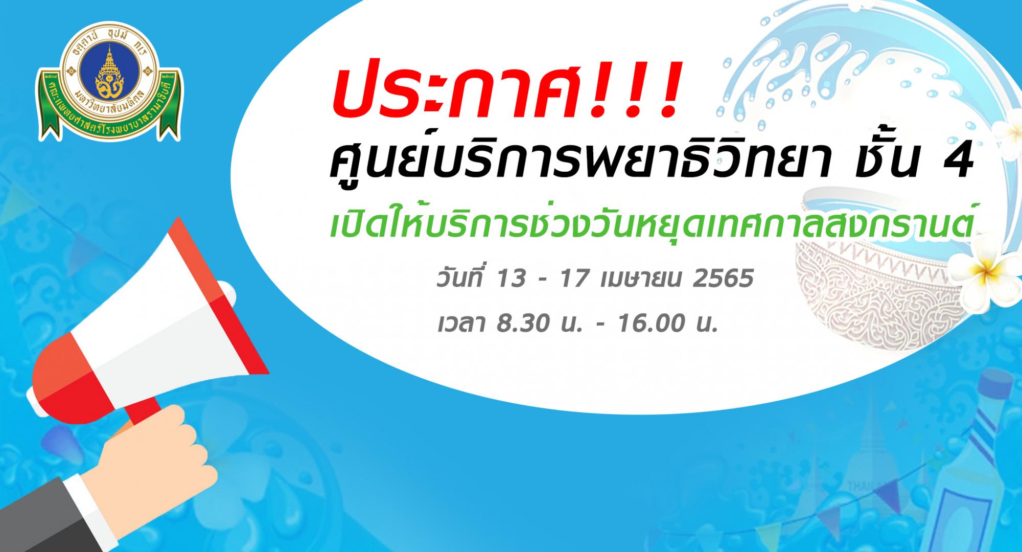 ประกาศ!!! ศูนย์บริการพยาธิวิทยาเปิดทำการตามปกติ เปิดให้บริการช่วงวันหยุดเทศกาลสงกรานต์ วันที่ 13-17 เมษายน 2565 เวลา 8.30 น. - 16.00 น.
