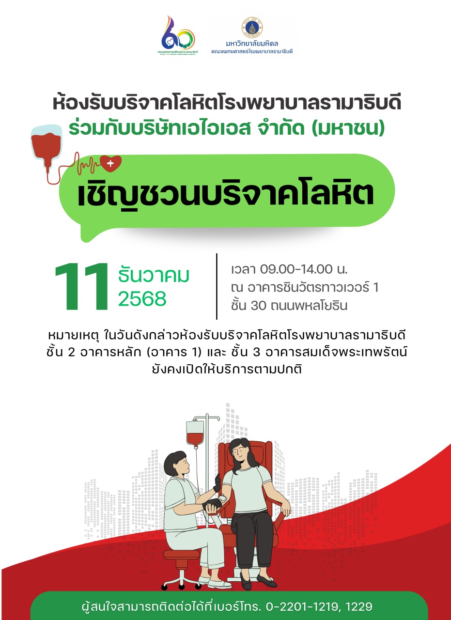 ห้องรับบริจาคโลหิตโรงพยาบาลรามาธิบดี ร่วมกับบริษัทเอไอเอส จำกัด (มหาชน) เชิญชวนบริจาคโลหิต