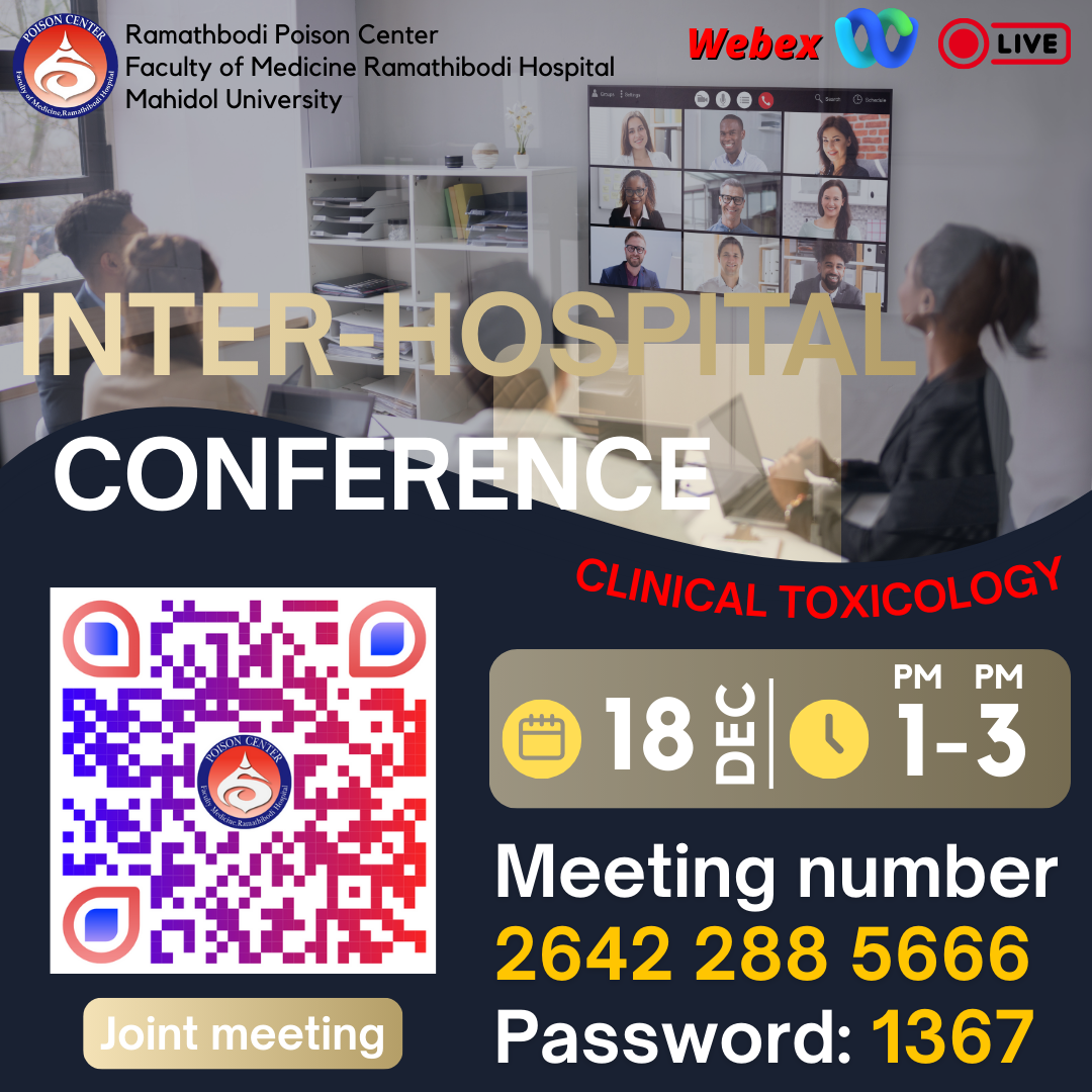 Inter-Hospital Conference on Clinical Toxicology ประจำเดือน: ธันวาคม ปีงบประมาณ 2569 ในวันพฤหัสบดีที่ 18 ตุลาคม พ.ศ. 2568 เวลา 13:00-15:00 น. จัดโดย: คณะแพทยศาสตร์โรงพยาบาลรามาธิบดี ดำเนินการจัดประชุมเป็นรูปแบบภาษาอังกฤษ