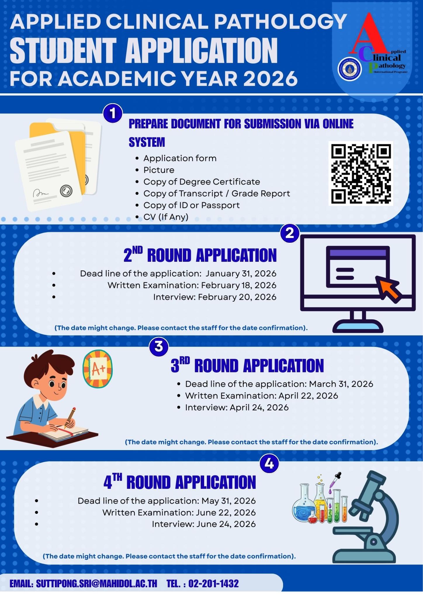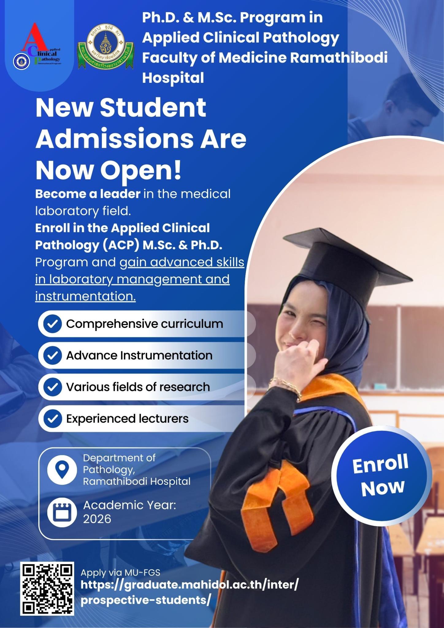 Master of Science & Doctor of Philosophy in Applied Clinical Pathology, Department of Pathology, Faculty of Medicine Ramathibodi Hospital, Mahidol University, is now accepting applications for the Academic Year 2026.