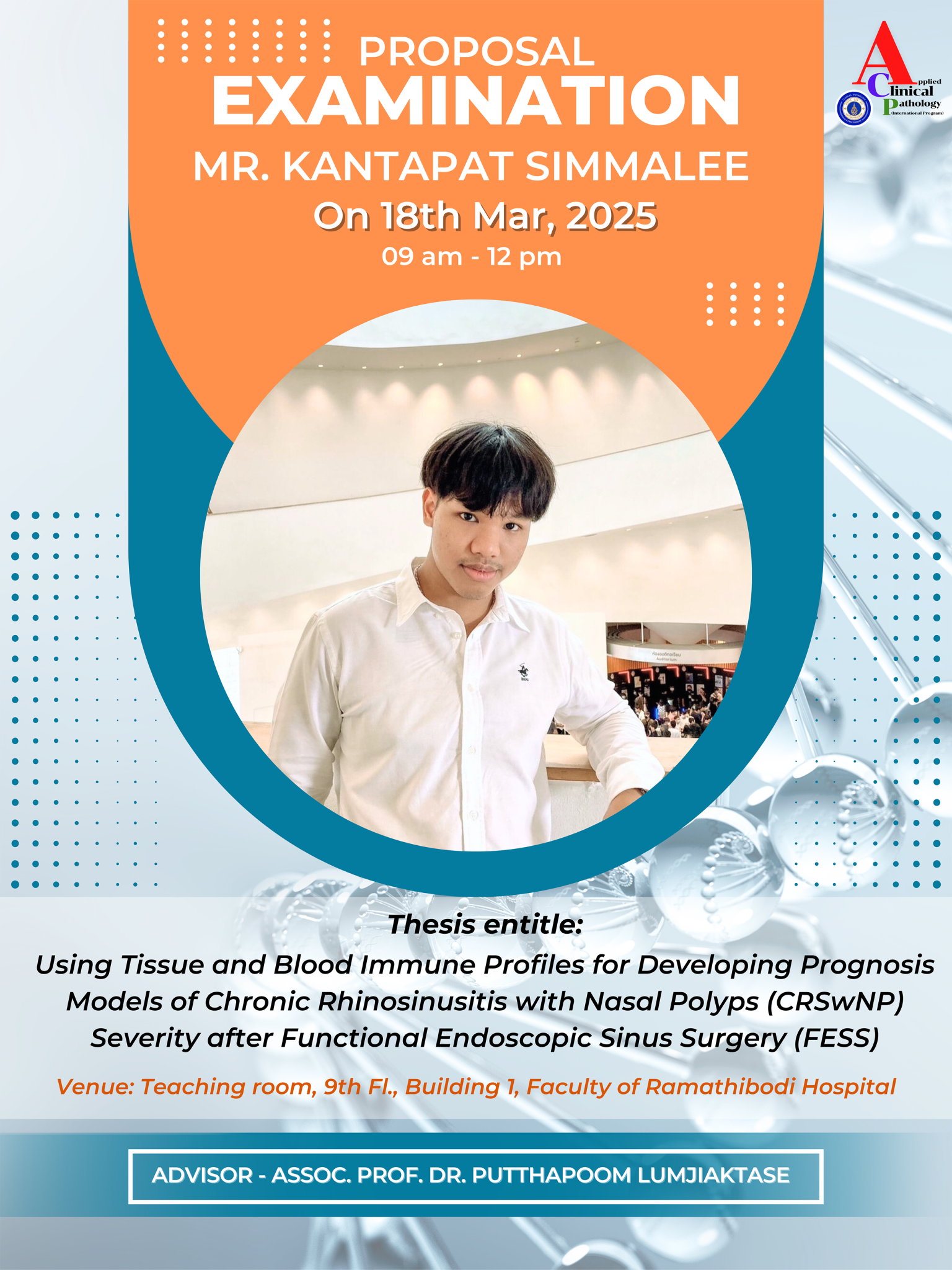 The Applied Clinical Pathology is pleased to announce the proposal examination of Mr. Kantapat Simmalee. The details are as follows: