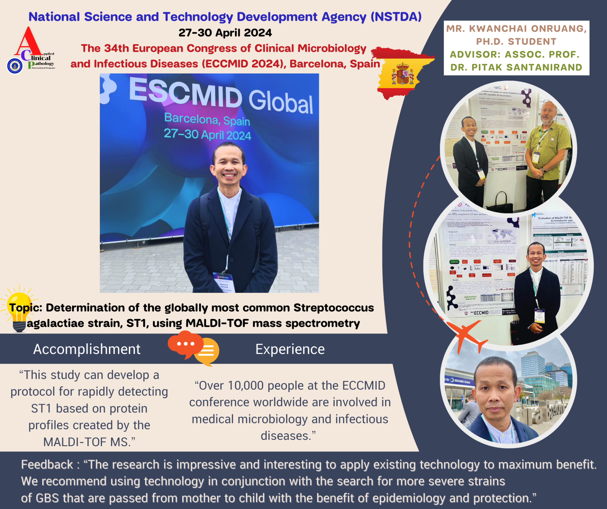 Congratulations to Mr. Kwanchai Onruang, Ph.D. student in the Clinical Pathology (International Program), who has received a scholarship from the National Science and Technology Development Agency (NSTDA) and has the opportunity to present his research on "Determination of the globally most common Streptococcus agalactiae strain, ST1, using MALDI-TOF mass spectrometry" at the 34th European Congress of Clinical Microbiology and Infectious Diseases (ECCMID 2024) in Barcelona, Spain.