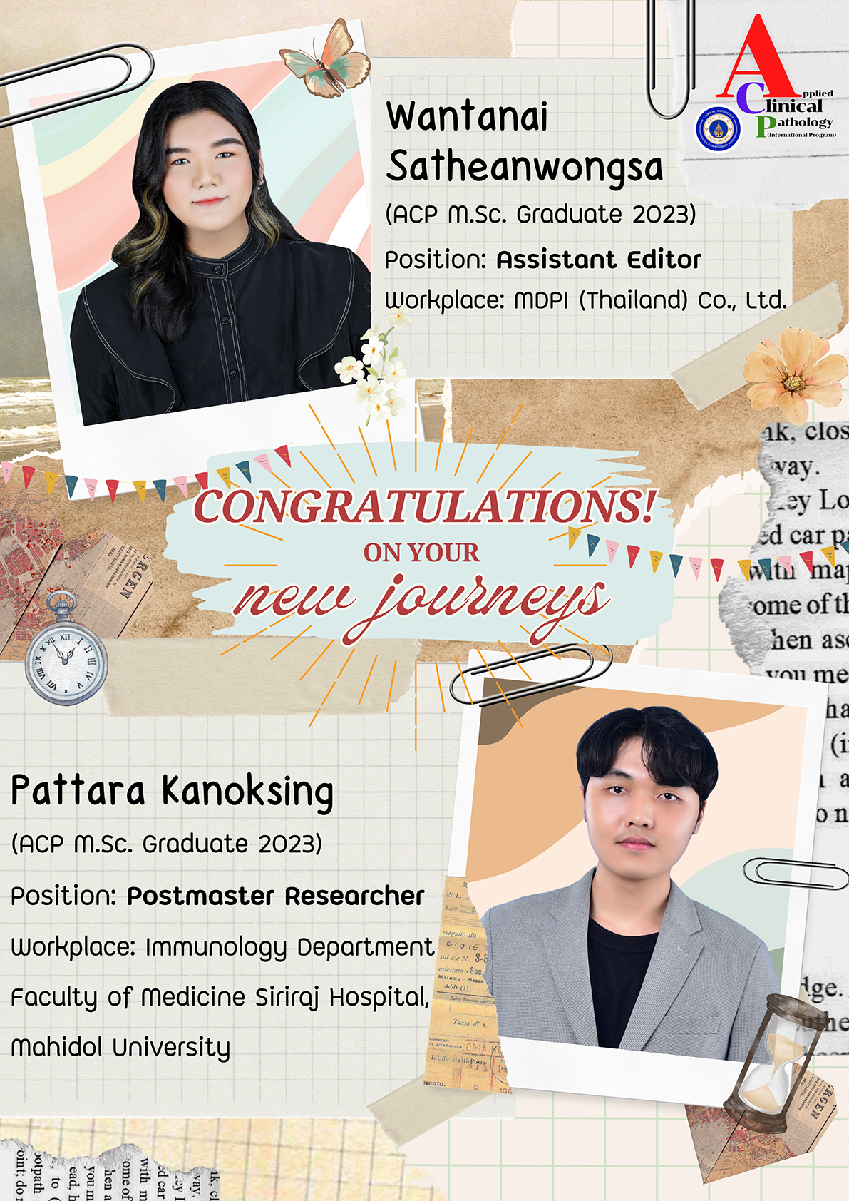 The Applied Clinical Pathology Program would like to congratulate the two Master’s degree graduates of the 2023 academic year, Mr. Wantanai Satheanwongsa and Mr. Pattara Kanoksing, on securing immediate employment after graduation.