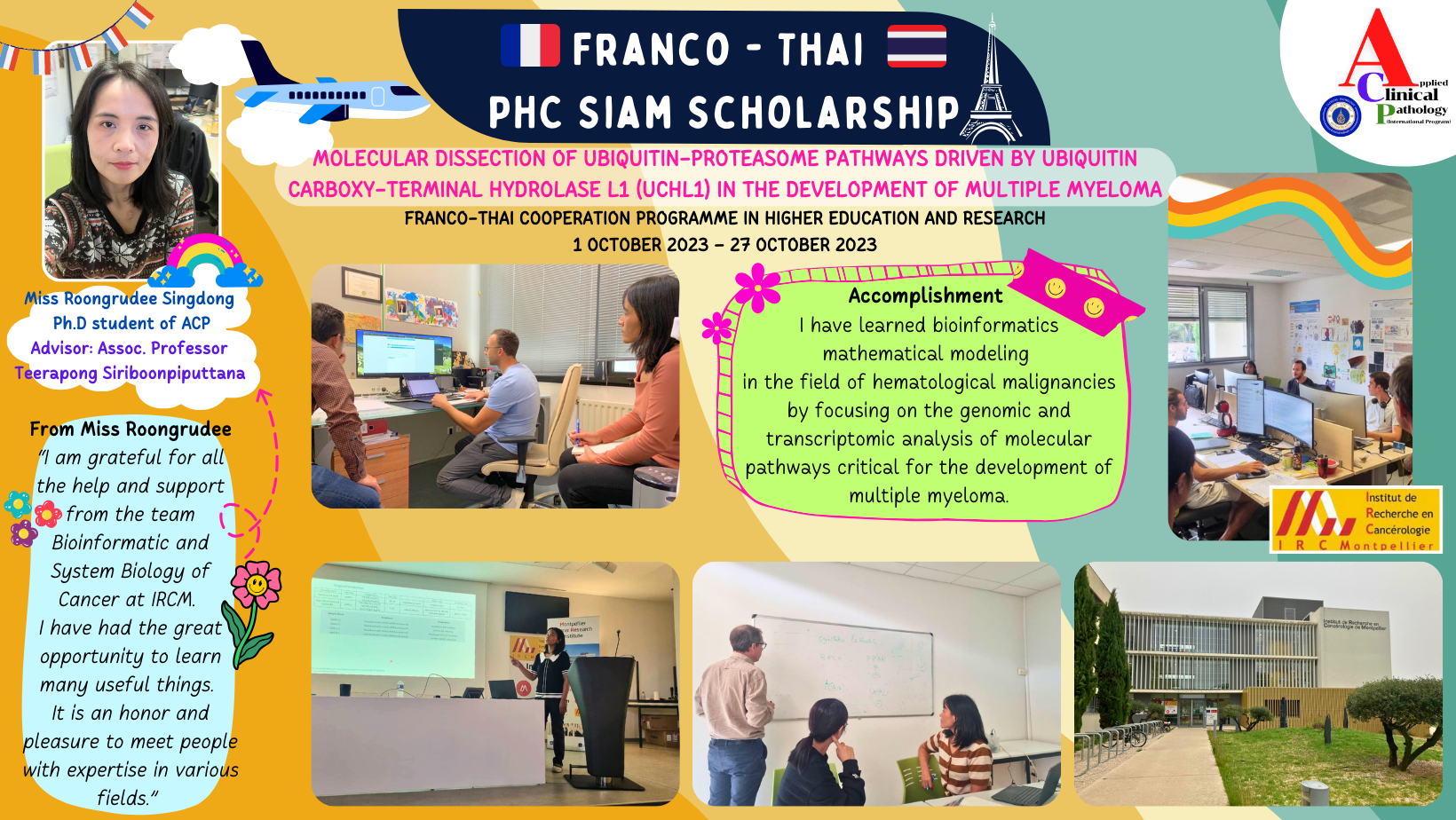for receiving FRANCO - THAI PHC SIAM Scholarship and for having an opportunity to conduct research in Molecular dissection of ubiquitin-proteasome pathways driven by Ubiquitin Carboxy-Terminal Hydrolase L1 (UCHL1) in the development of multiple myeloma at Institut de Recherche en Cancerologie de Montpellier, France, 1-27 October 2023.