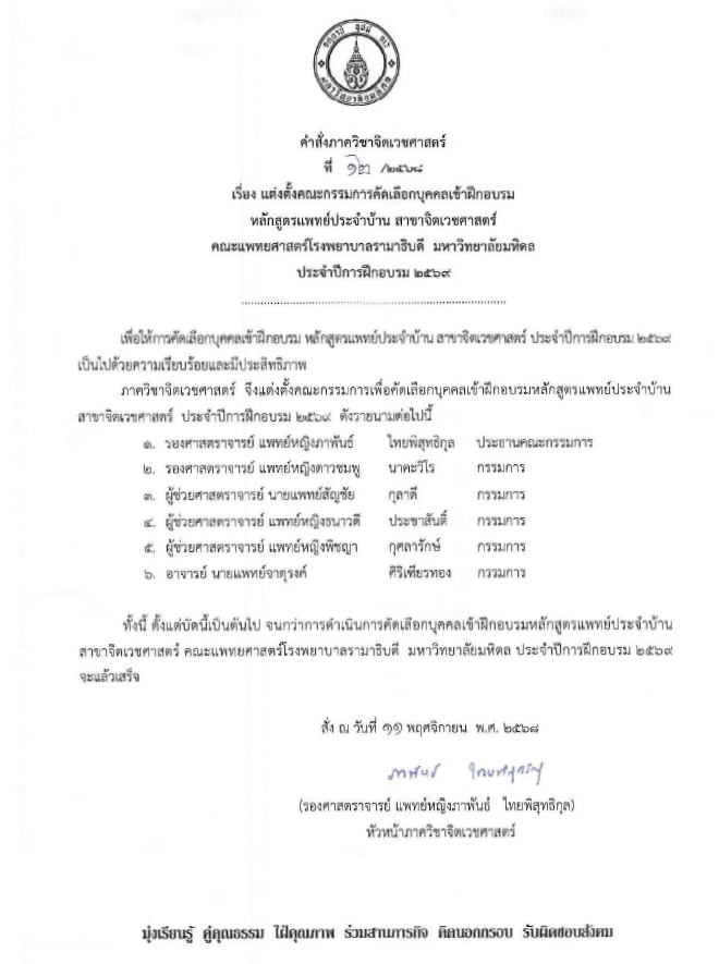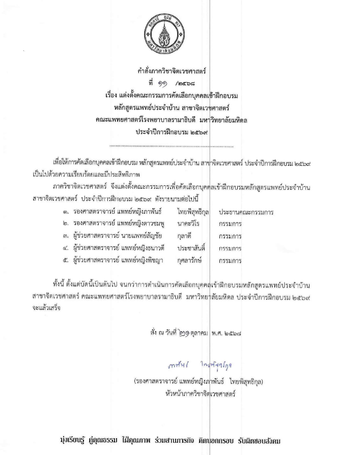 หัวหน้าภาควิชาจิตเวชศาสตร์ ออกคำสั่งแต่งตั้งคณะกรรมการคัดเลือกแพทย์ประจำบ้านจิตเวชศาสตร์ ก่อนวันกำหนดสอบสัมภาษณ์ โดยประกอบด้วย