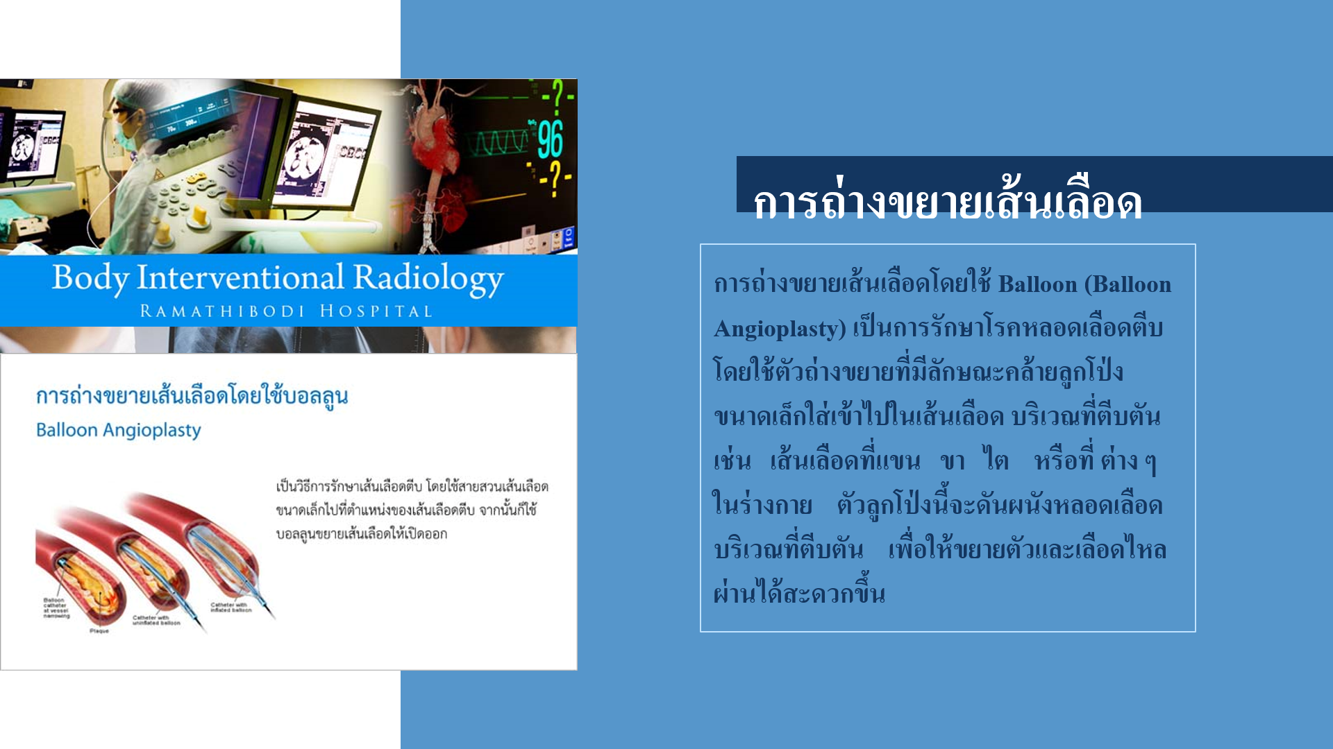 การถ่างขยายเส้นเลือดโดยใช้ Balloon (Balloon Angioplasty) เป็นการรักษาโรคหลอดเลือดตีบ โดยใช้ตัวถ่างขยายที่มีลักษณะคล้ายลูกโป่งขนาดเล็กใส่เข้าไปในเส้นเลือด บริเวณที่ตีบตัน เช่น เส้นเลือดที่แขน ขา ไต หรือที่ต่างๆ ในร่างกาย ตัวลูกโป่งนี้จะดันผนังหลอดเลือดบริเวณที่ตีบตัน เพื่อให้ขยายตัวและเลือดไหลผ่านได้สะดวกขึ้น