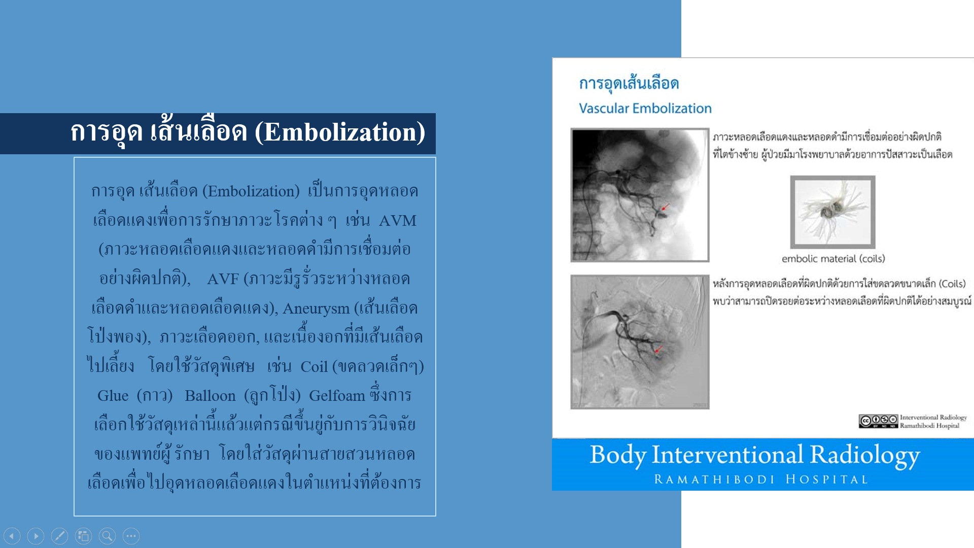 การอุด เส้นเลือด (Embolization) เป็นการอุดหลอดเลือดแดงเพื่อการรักษาภาวะโรคต่างๆ เช่น AVM (ภาวะหลอดเลือดแดงและหลอดดำมีการเชื่อมต่ออย่างผิดปกติ), AVF (ภาวะมีรูรั่วระหว่างหลอดเลือดดำและหลอดเลือดแดง), Aneurysm (เส้นเลือดโป่งพอง), ภาวะเลือดออก, และเนื้องอกที่มีเส้นเลือดไปเลี้ยง โดยใช้วัสดุพิเศษ เช่น Coil (ขดลวดเล็กๆ) Glue (กาว) Balloon (ลูกโป่ง) Gelfoam ซึ่งการเลือกใช้วัสดุเหล่านี้แล้วแต่กรณีขึ้นยู่กับการวินิจฉัยของแพทย์ผู้ รักษา โดยใส่วัสดุผ่านสายสวนหลอดเลือดเพื่อไปอุดหลอดเลือดแดงในตำแหน่งที่ต้องการ
