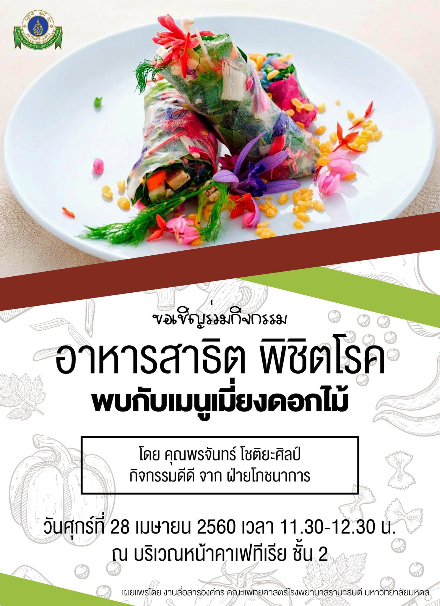 ขอเชิญร่วมกิจกรรม อาหารสาธิต พิชิตโรค พบกับเมนูเมี่ยงดอกไม้ โดยคุณพรจันทร์ โชติยะศิลป์ กิจกรรมดีดี จากฝ่ายโภชนาการ วันศุกร์ที่ 28 เมษายน 2560 เวลา 11.30 – 12.30 น. ณ บริเวณหน้าคาเฟทีเรีย ชั้น 2