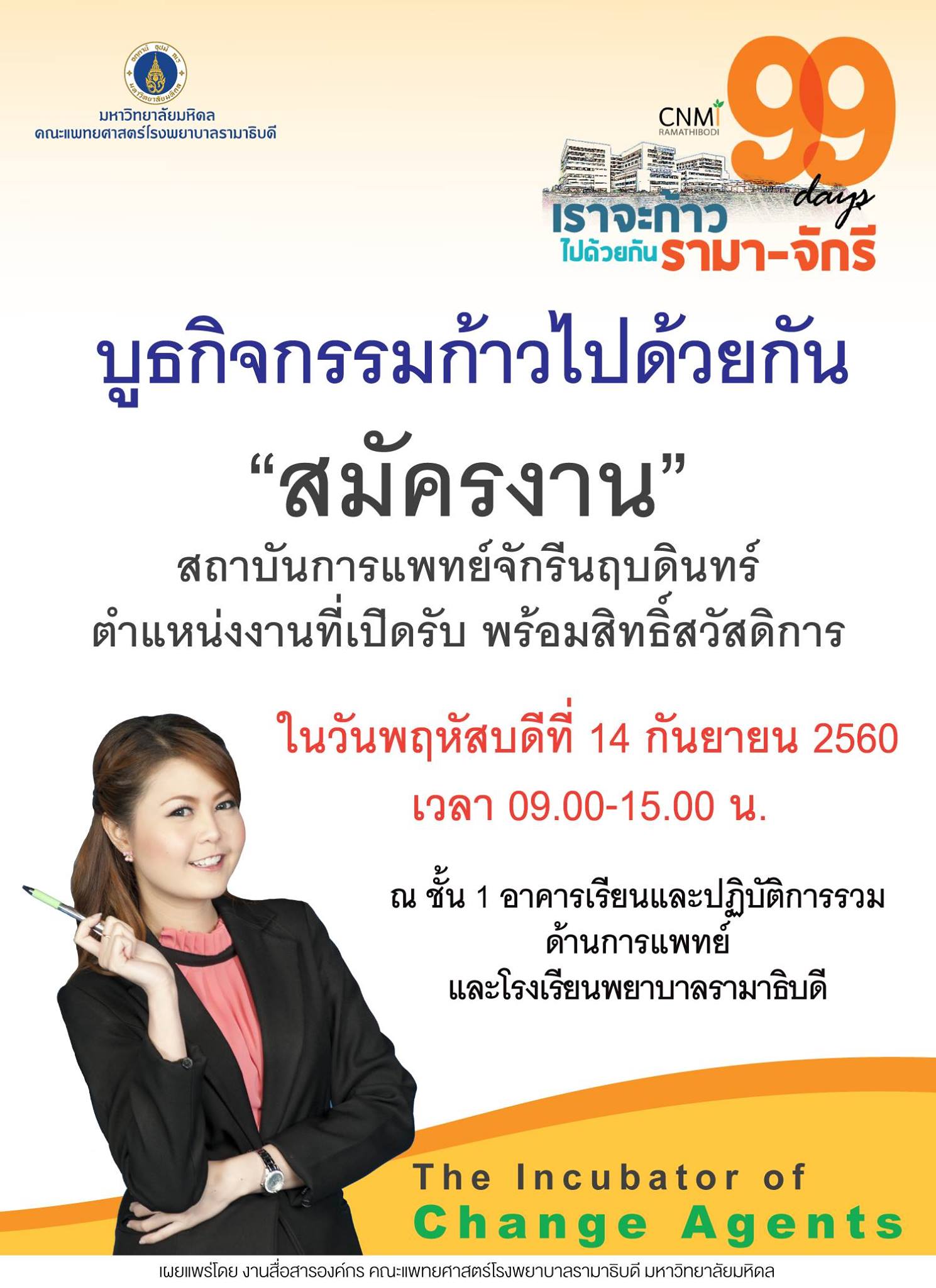 ในวันพฤหัสบดีที่ 14 กันยายน 2560 เวลา 09.00 – 15.00 น. ณ ชั้น 1 อาคารเรียนและปฏิบัติการรวมด้านการแพทย์และโรงเรียนพยาบาลรามาธิบดี