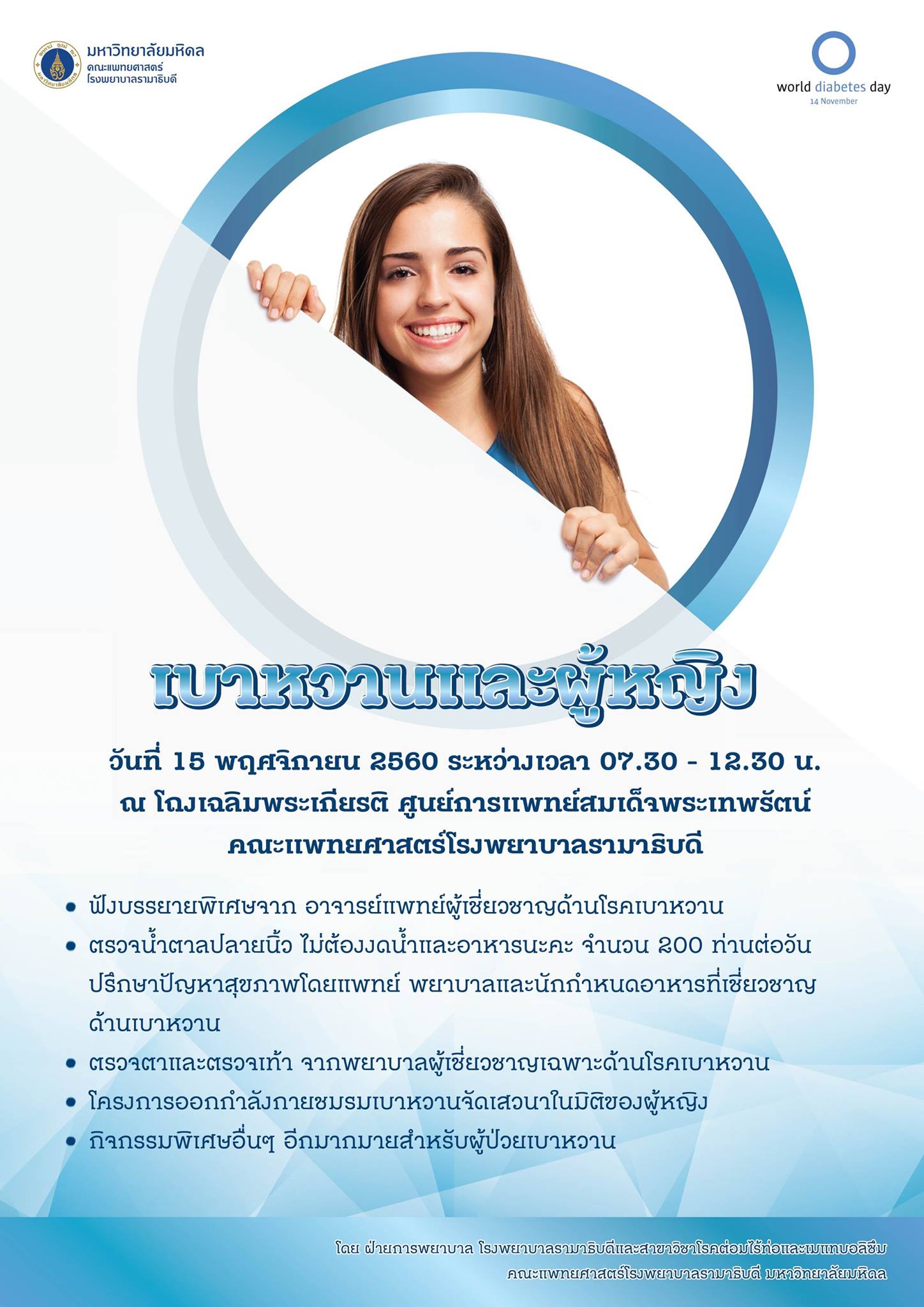 ขอเชิญร่วมงานเบาหวานและผู้หญิง วันที่ 15 พฤศจิกายน 2560 เวลา 07.30 – 12.30 น. ณ โถงเฉลิมพระเกียรติ ศูนย์การแพทย์สมเด็จพระเทพรัตน์ คณะแพทยศาสตร์โรงพยาบาลรามาธิบดี