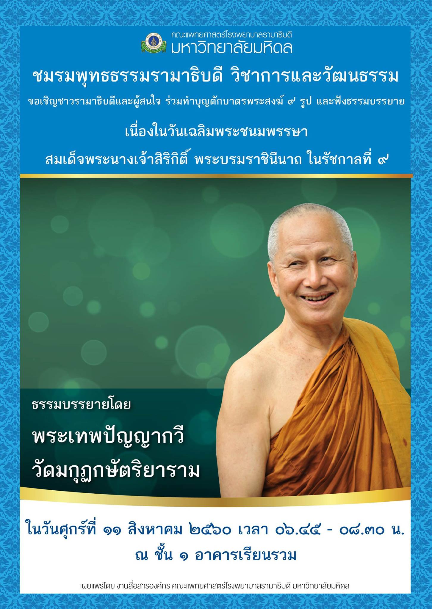 ขอเชิญชาวรามาธิบดีและผู้สนใจ ร่วมทําบุญตักบาตรพระสงฆ์ ๙ รูป และฟังธรรมบรรยาย