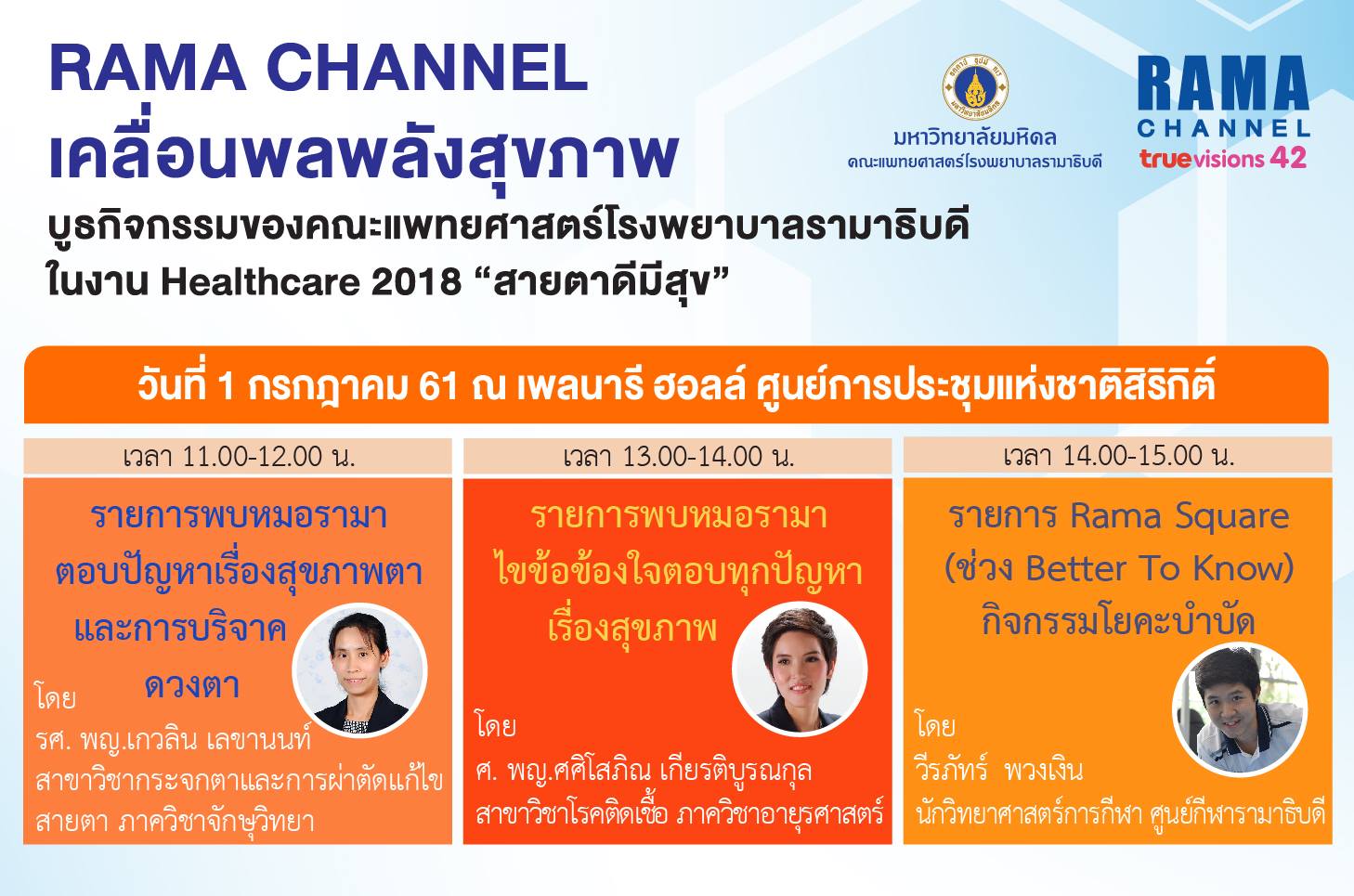 สถานีโทรทัศน์ RAMA CHANNEL เคลื่อนพลพลังสุขภาพรูปแบบ Mini Stage ในงาน Healthcare 2018 “สายตาดีมีสุข” วันที่ 1 กรกฎาคม 2561 ณ เพลนารี ฮอลล์ ศูนย์การประชุมแห่งชาติสิริกิติ์