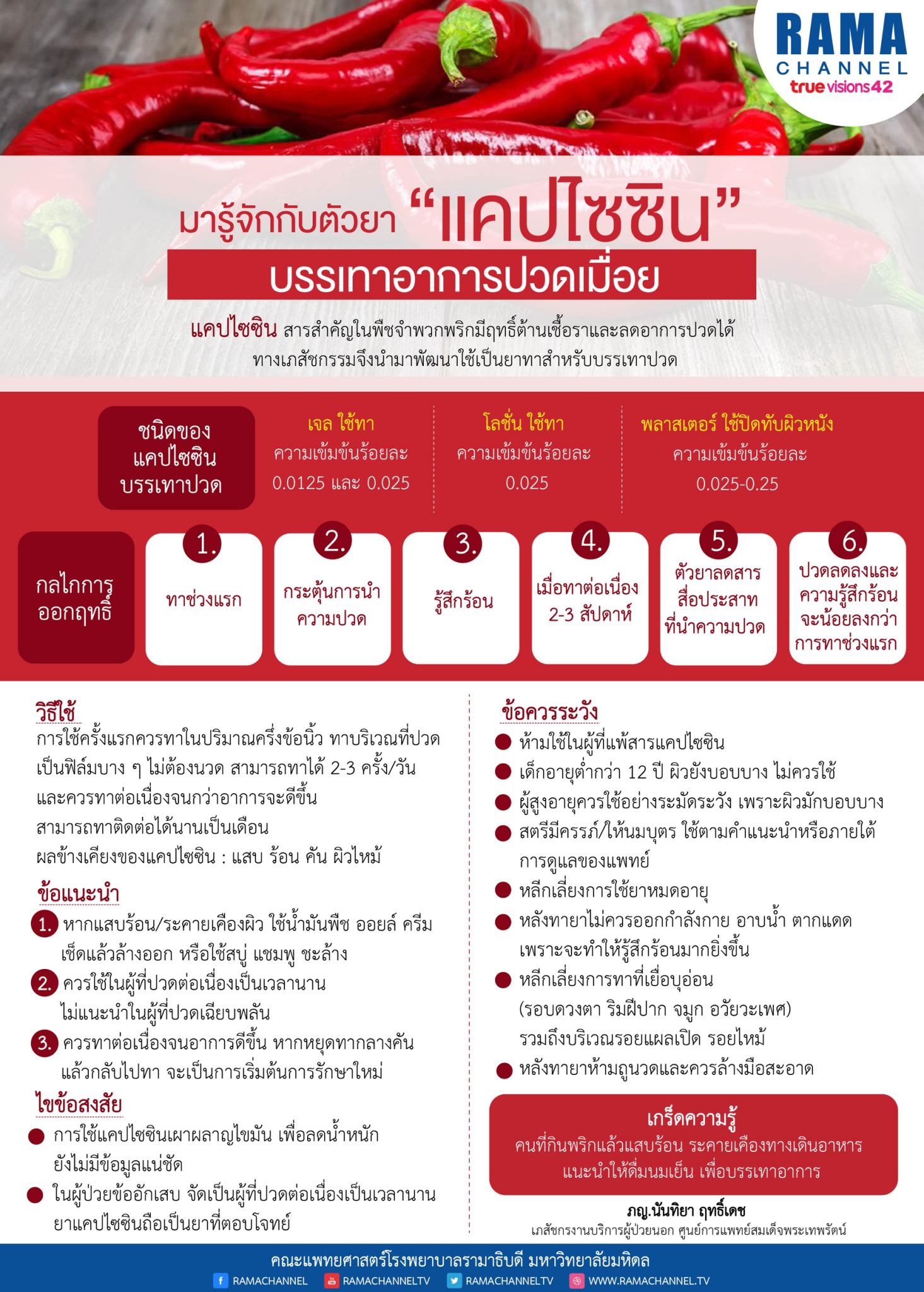คลิกชมคลิปรายการ “บรรเทาอาการปวดเมื่อยด้วยตัวยา “แคปไซซิน” : Rama Square ช่วง สาระปันยา” ได้ที่นี่