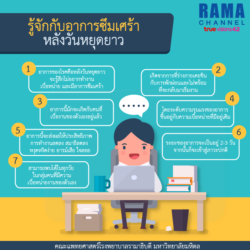 - อาการของโรคคือหลังวันหยุดยาว จะรู้สึกไม่อยากทำงาน เบื่อหน่าย และมีอาการซึมเศร้า