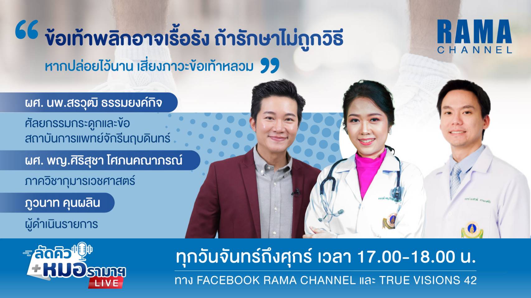 ติดตามเรื่องราวได้ในรายการลัดคิวหมอรามาฯ รายการที่คุณสามารถแช็ตถาม หรือโทรถามหมอแบบสด ๆ ได้โดยไม่ต้องต่อคิว