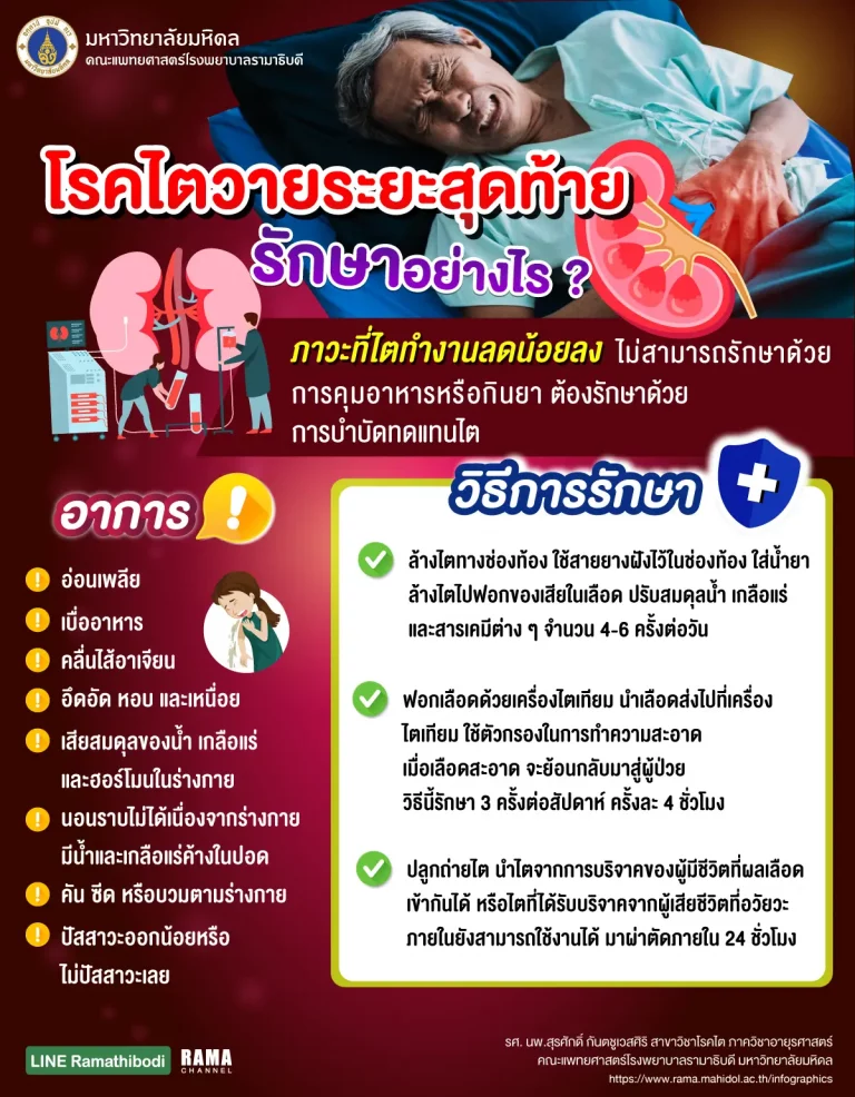 โรคไตวายระยะสุดท้าย เป็นภาวะที่ไตทำงานลดน้อยลงกว่าร้อยละ 15 ของปกติซึ่งหน้าที่หลักในการขับของเสียของไตนั้นจะลดลงจนไม่สามารถใช้ชีวิตตามปกติได้