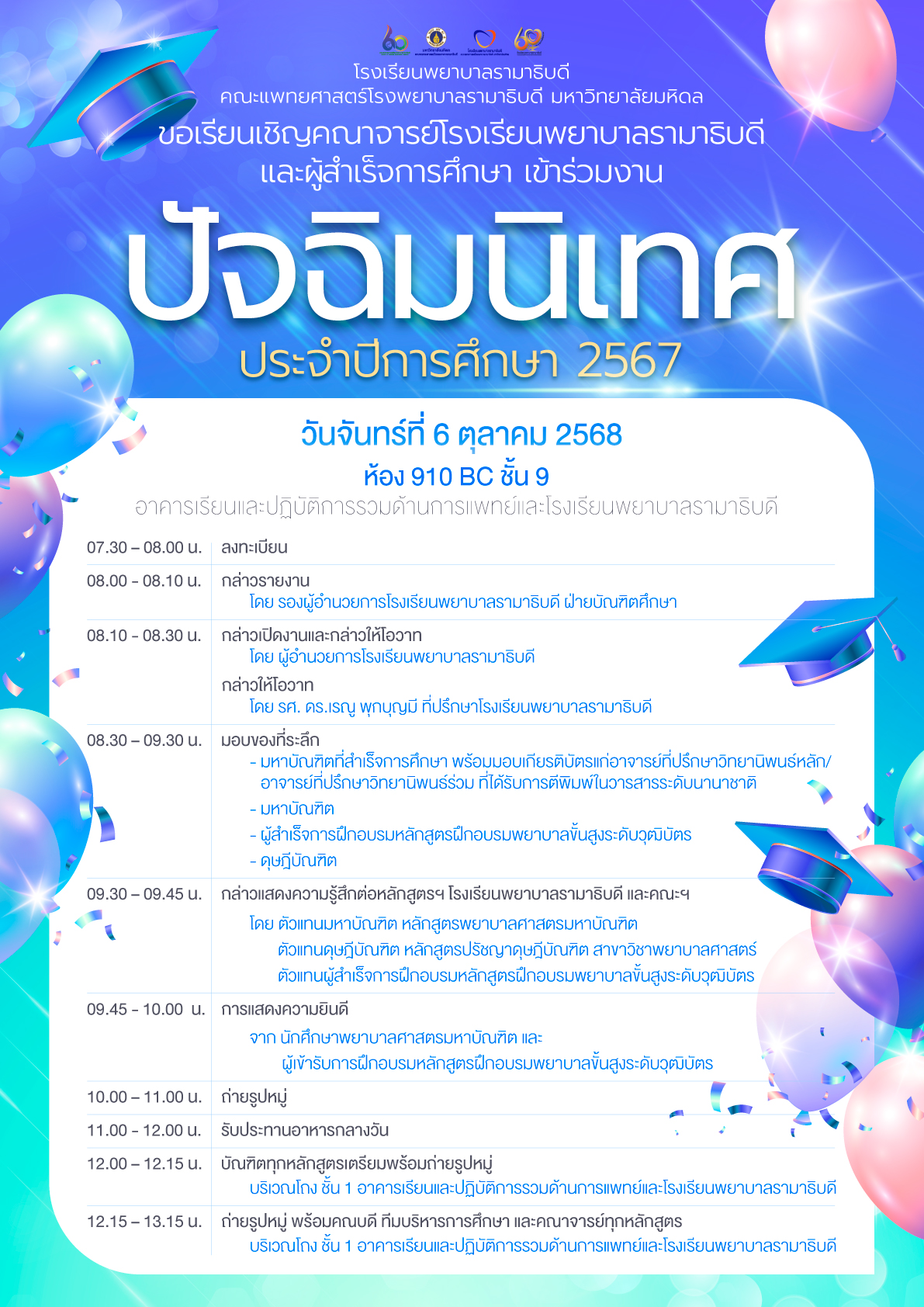 ขอเรียนเชิญคณาจารย์โรงเรียนพยาบาลรามาธิบดี และผู้สำเร็จการศึกษา เข้าร่วมงาน ปัจฉิมนิเทศ ประจำปีการศึกษา 2567