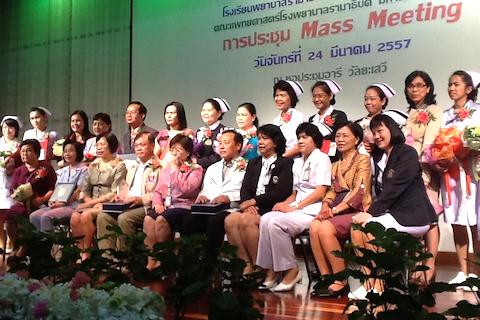 ผศ.ดร.พูลสุข เจนพานิชย์ วิสุทธิพันธ์ ขึ้น รับช่อดอกไม้แสดงความยินดีจากผู้อำนวยการโรงเรียนพยาบาลรามาธิบดี ในโอกาสที่ได้รับตำแหน่งนายกสมาคมศิษย์เก่าพยาบาลรามาธิบดี ในที่ประชุม Mass Meeting วันจันทร์ที่ 24 มีนาคม 2557
