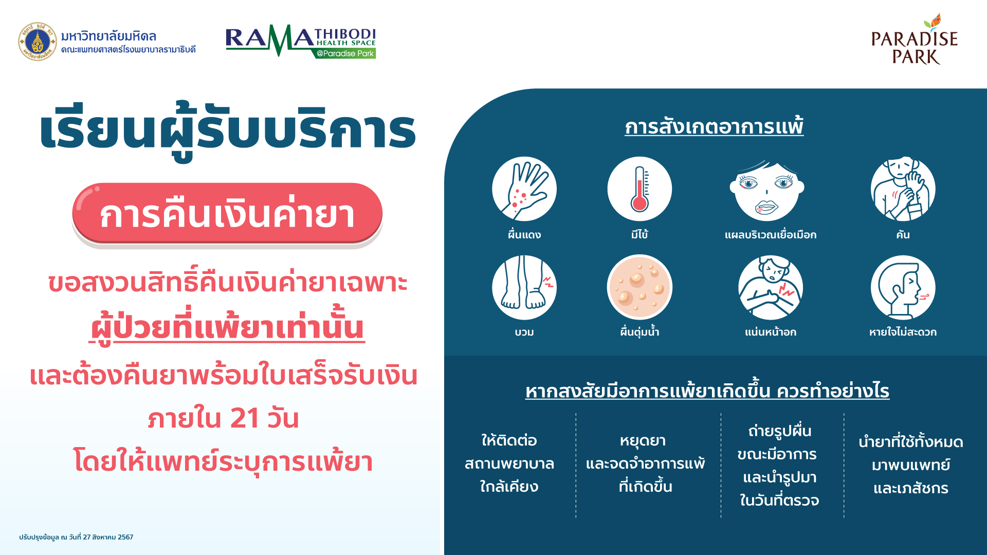 เรียบผู้รับบริการ การคืนเงินค่ายา ขอสงวนสิทธิ์คืนเงินค่ายาเฉพาะ ผู้ป่วยที่แพ้ยาเท่านั้น