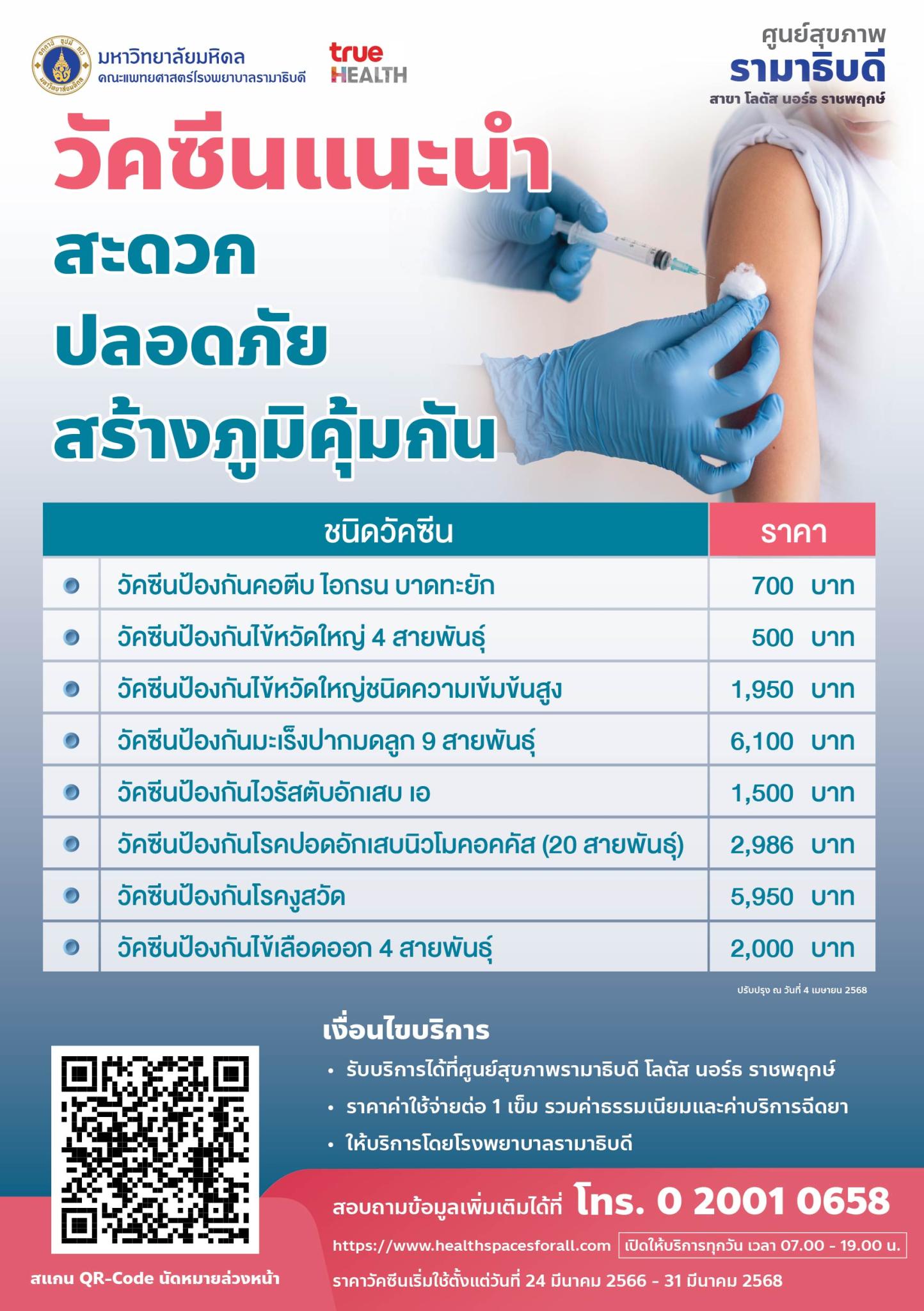 วัคซีนแนะนำ สะดวก ปลอดภัย สร้างภูมิคุ้มกัน ที่ ศูนย์สุขภาพ รามาธิบดี สาขา โลตัส นอร์ธ ราชพฤกษ์