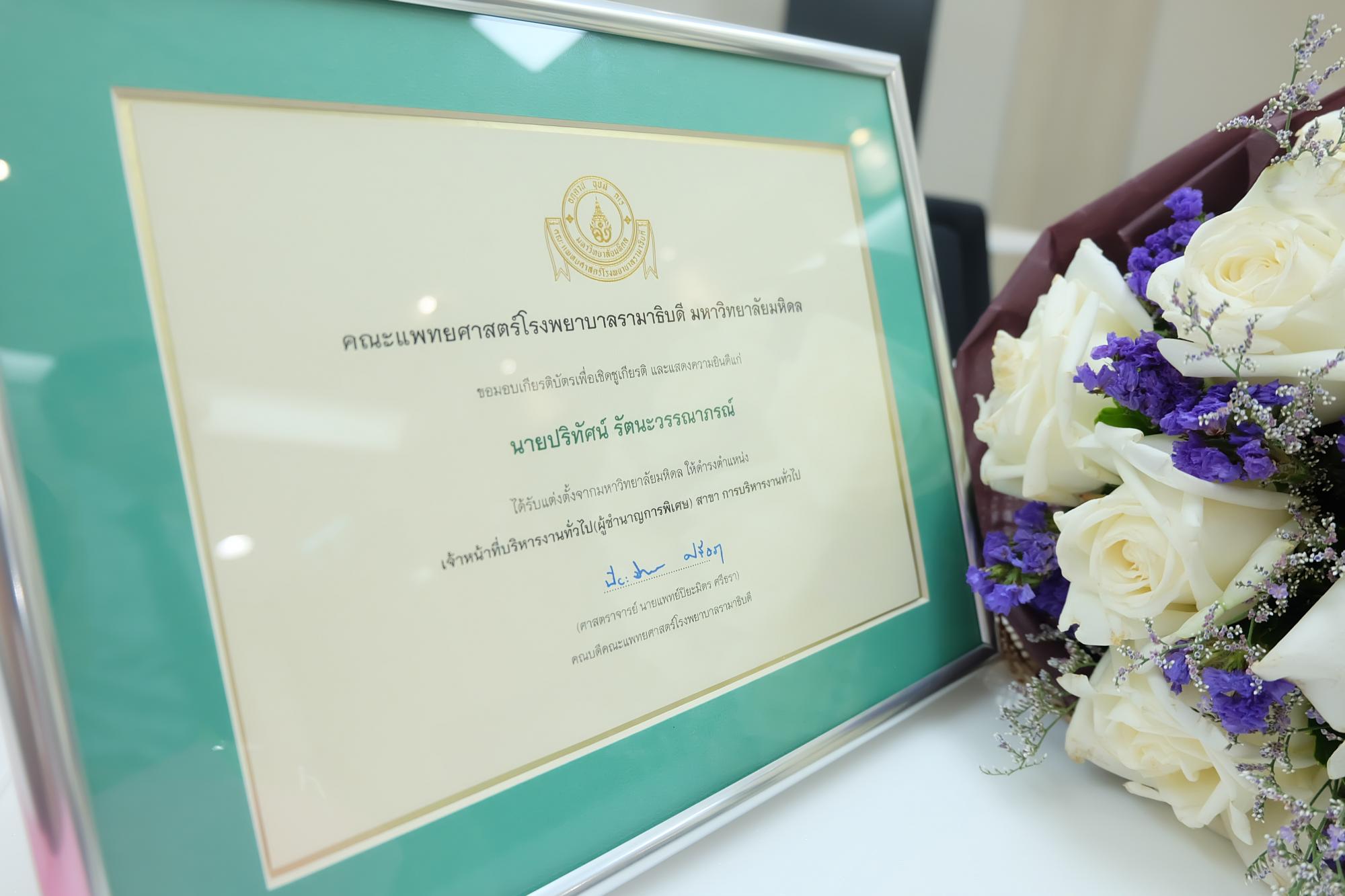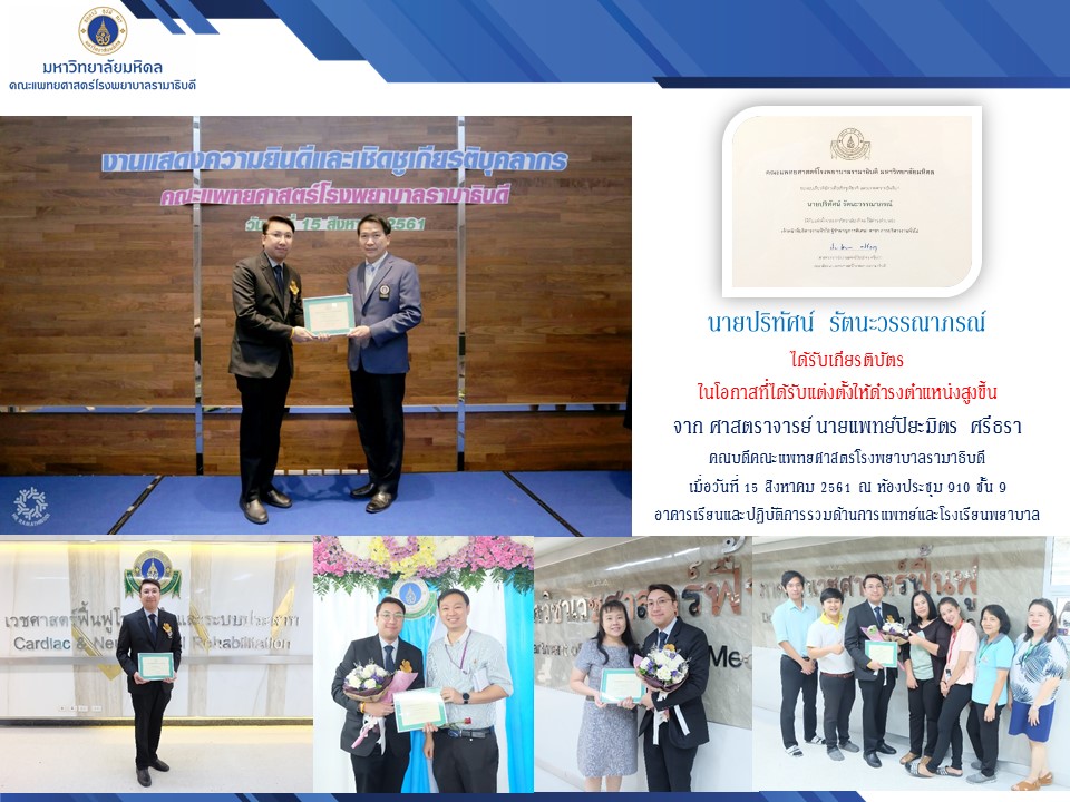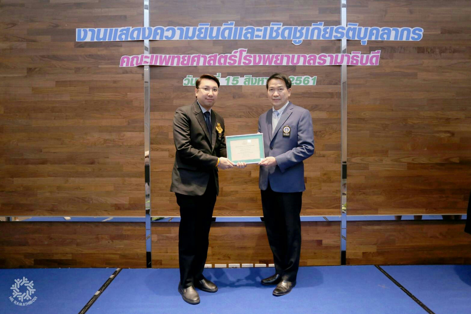 จาก ศ.นพ.ปิยะมิตร ศรีธรา คณบดีคณะแพทยศาสตร์โรงพยาบาลรามาธิบดี เมื่อวันที่ 15 สิงหาคม 2561 ณ ห้องประชุม 910AB ชั้น 9