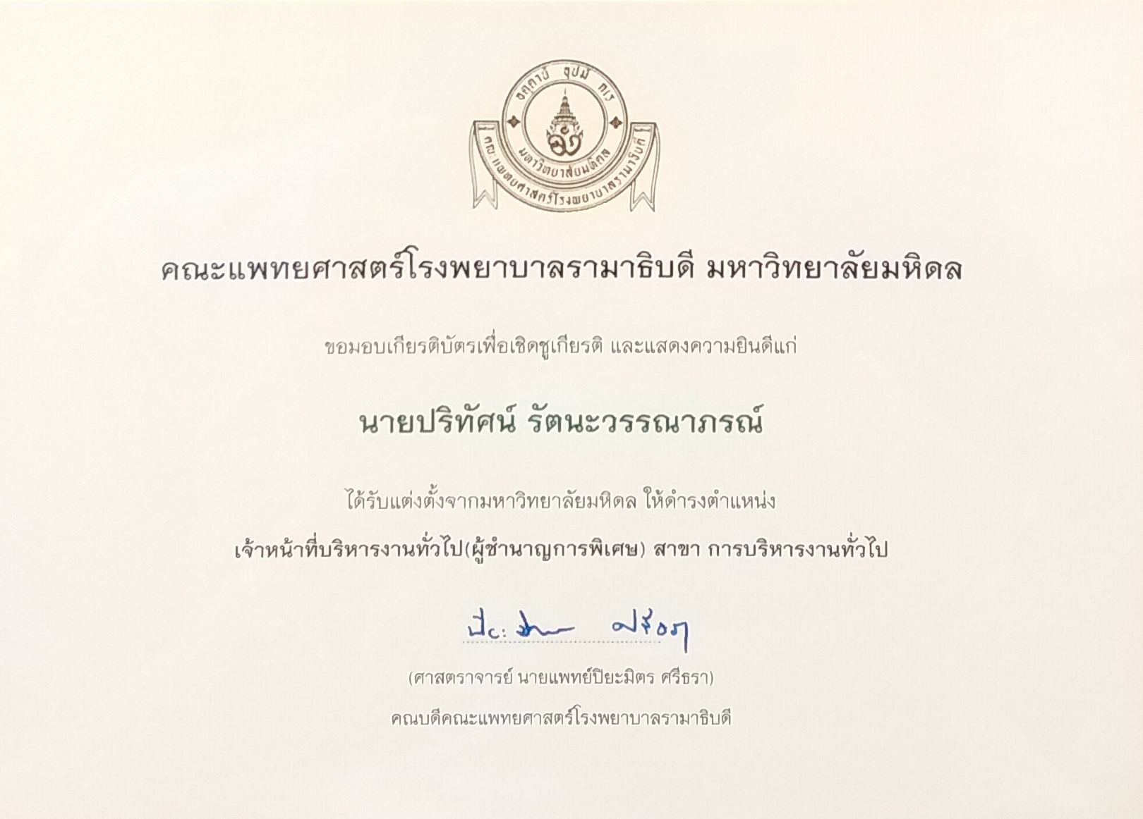 นายปริทัศน์ รัตนะวรรณาภรณ์ ได้รับเกียรติบัตรแสดงความยินดีในโอกาสที่ได้รับแต่งตั้งให้ดำรงตำแหน่งสูงขึ้น