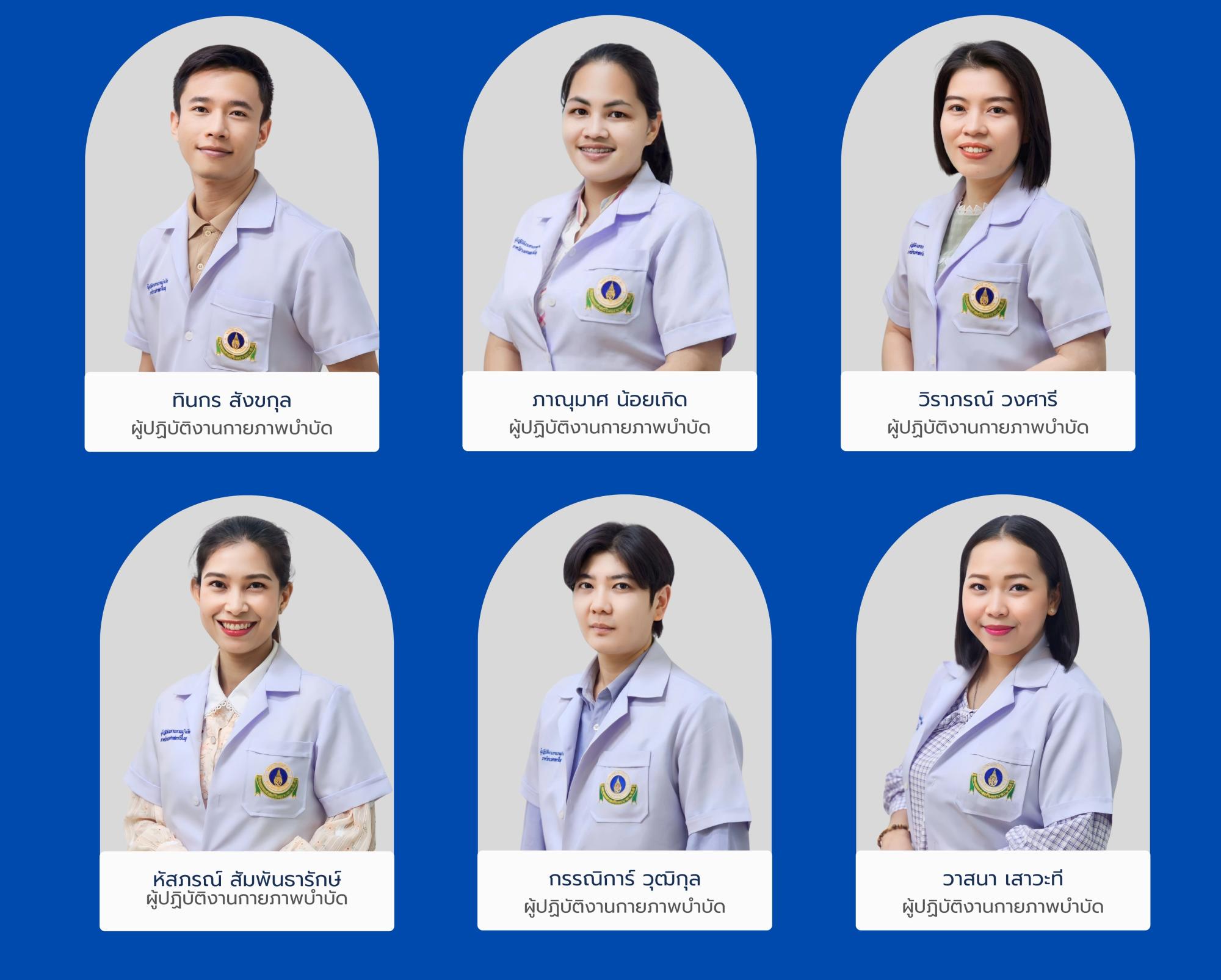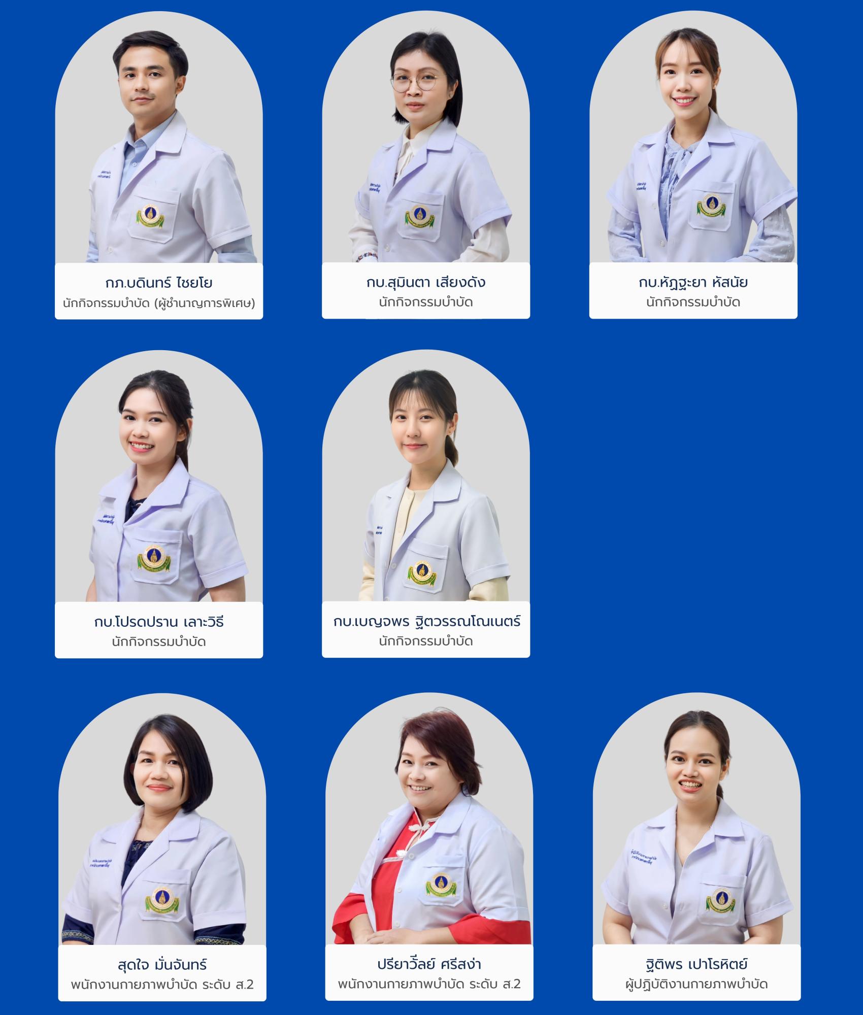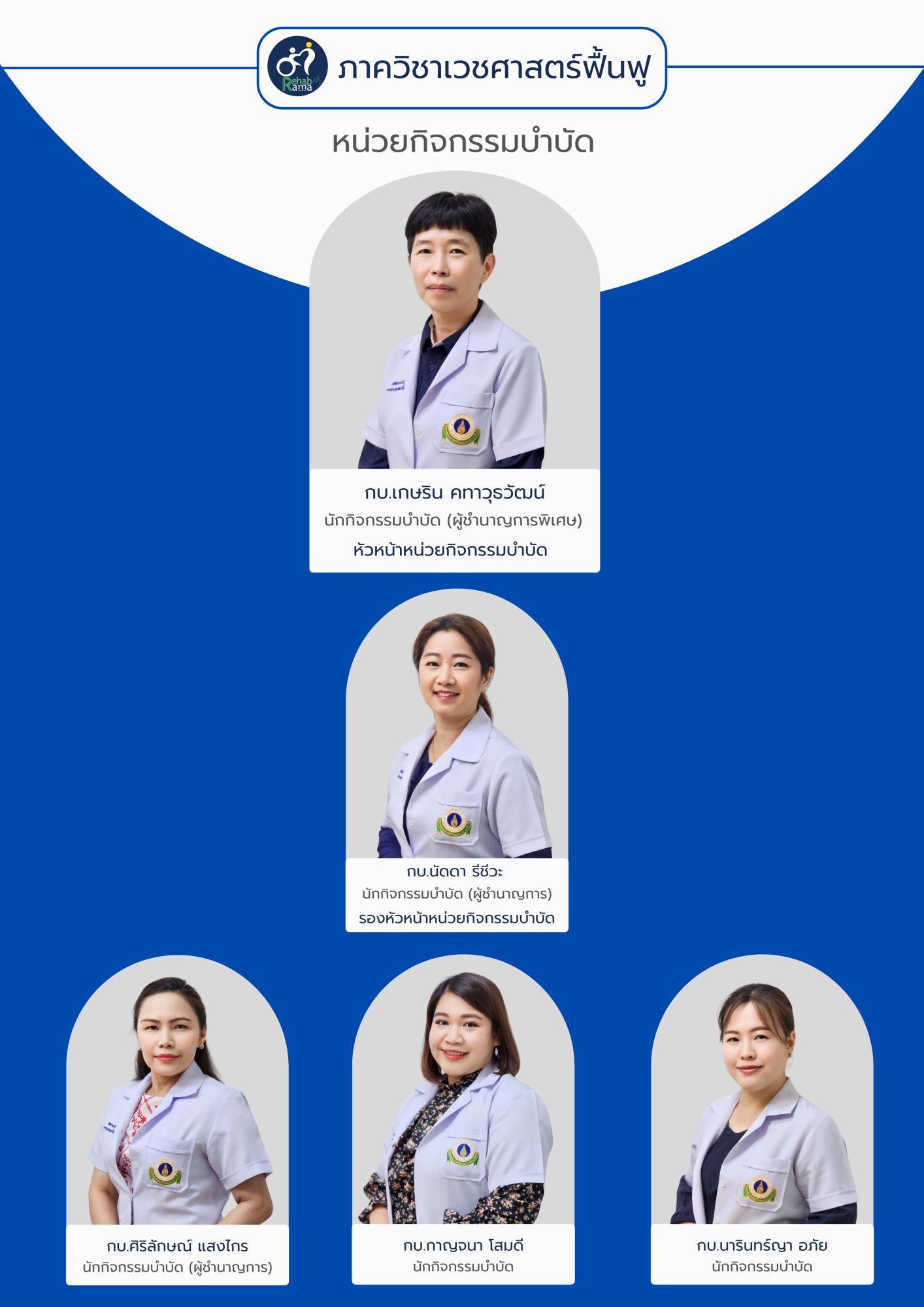 รายนามบุคลากรหน่วยกิจกรรมบำบัด สถานที่ตั้ง หน่วยกิจกรรมบำบัด งานเวชกรรมฟื้นฟู ภาควิชาเวชศาสตร์ฟื้นฟู อาคารหลัก (อาคาร 1) ชั้น 1 เลขที่ 270 ถนนพระรามที่ 6 แขวงทุ่งพญาไท เขตราชเทวี กรุงเทพมหานคร 10400 โทรศัพท์ 0-2201-2189 โทรสาร. 0-2201-2228