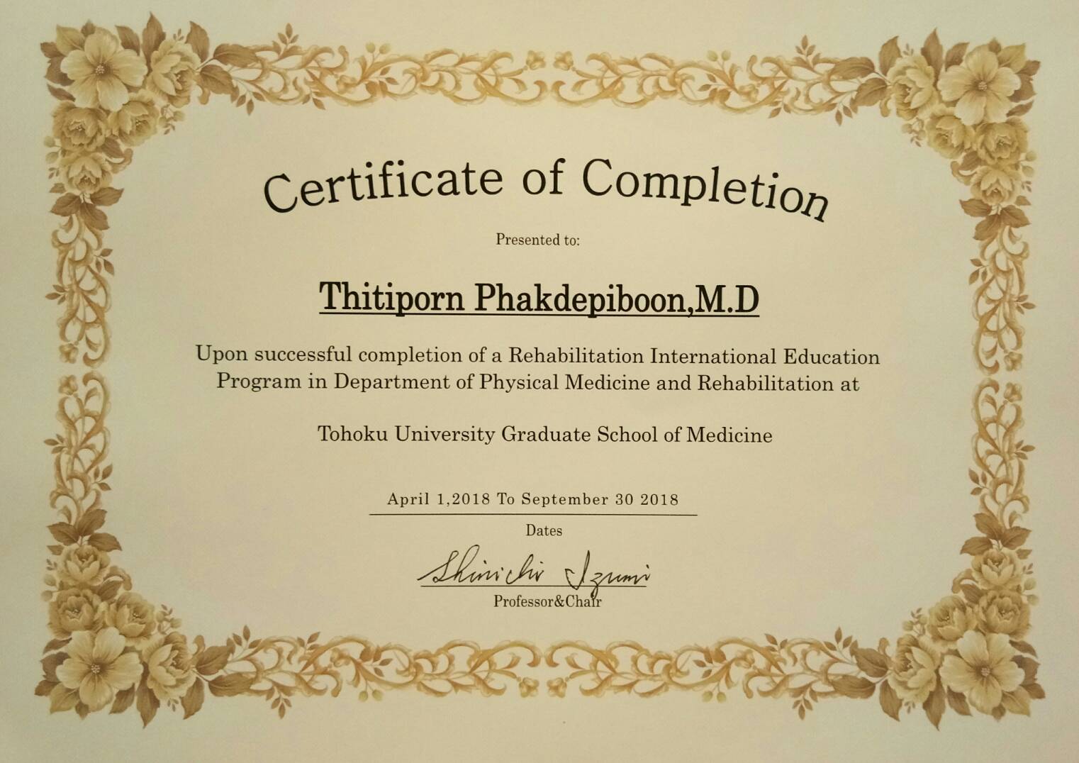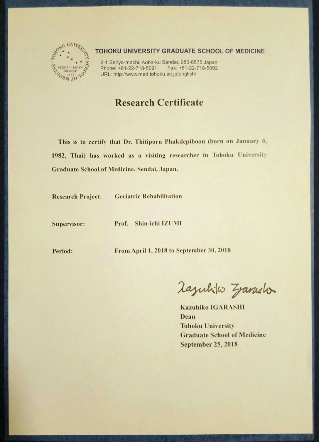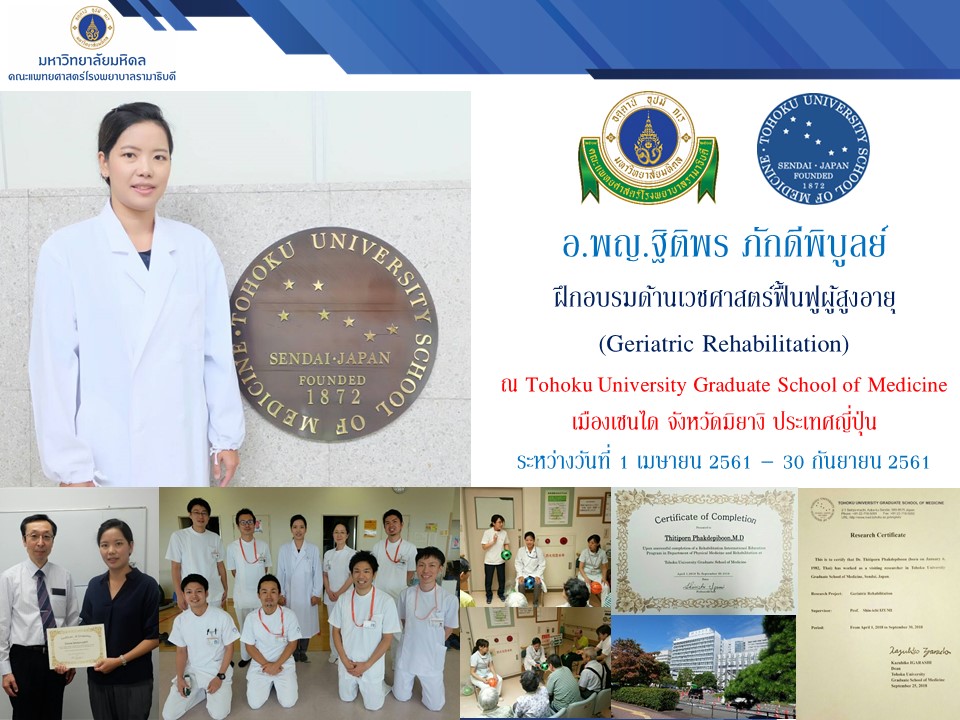 บุคลากรฝึกอบรม ณ ต่างประเทศ อ.พญ.ฐิติพร ภักดีพิบูลย์ ฝึกอบรม ด้านเวชศาสตร์ฟื้นฟูผู้สูงอายุ (Geriatric Rehabilitation) ณ Tohoku University Graduate School of Medicine ประเทศญี่ปุ่น ระหว่างวันที่ 1 เมษายน 2561 - 30 กันยายน 2561