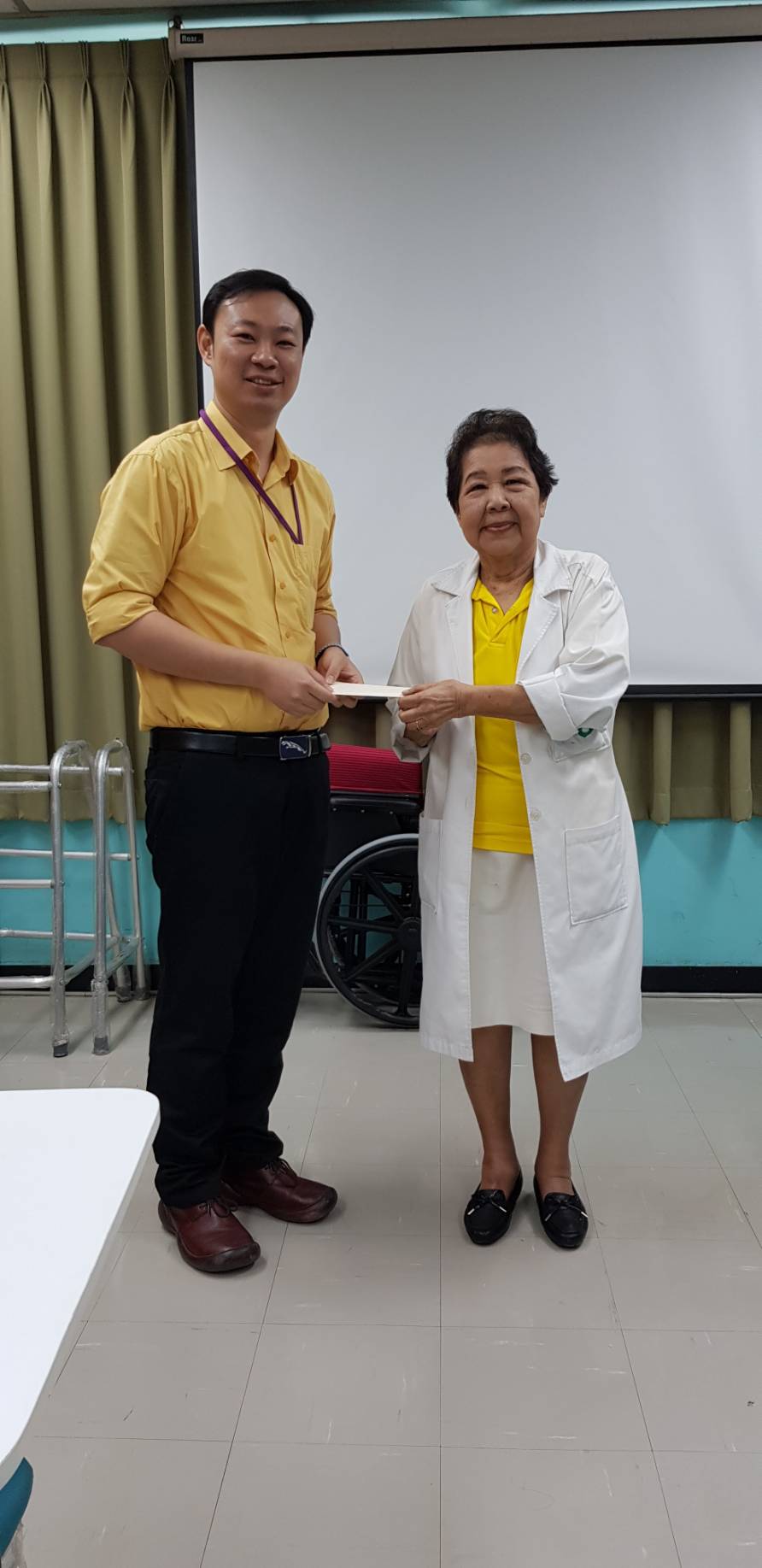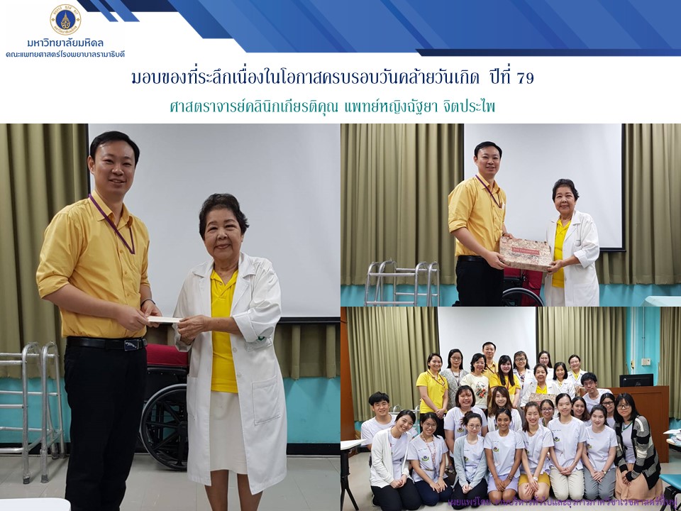 อ.ดร.นพ.ปรเมษฐ์ ฉายารัตนศิลป์ หัวหน้าภาควิชาเวชศาสตร์ฟื้นฟู พร้อมด้วยคณาจารย์ และ แพทย์ประจำบ้านเวชศาสตร์ฟื้นฟู มอบของที่ระลึกเนื่องโอกาสครบรอบวันคล้ายวันเกิดปีที่ 79 วันที่ 22 พฤษภาคม 2562 แด่ ศ.คลินิกเกียรติคุณ พญ.ฉัฐยา จิตประไพ วันจันทร์ที่ 13 พฤษภาคม 2562 ณ ห้องประชุมภาควิชาเวชศาสตร์ฟื้นฟู ชั้น 9 อาคาร 3