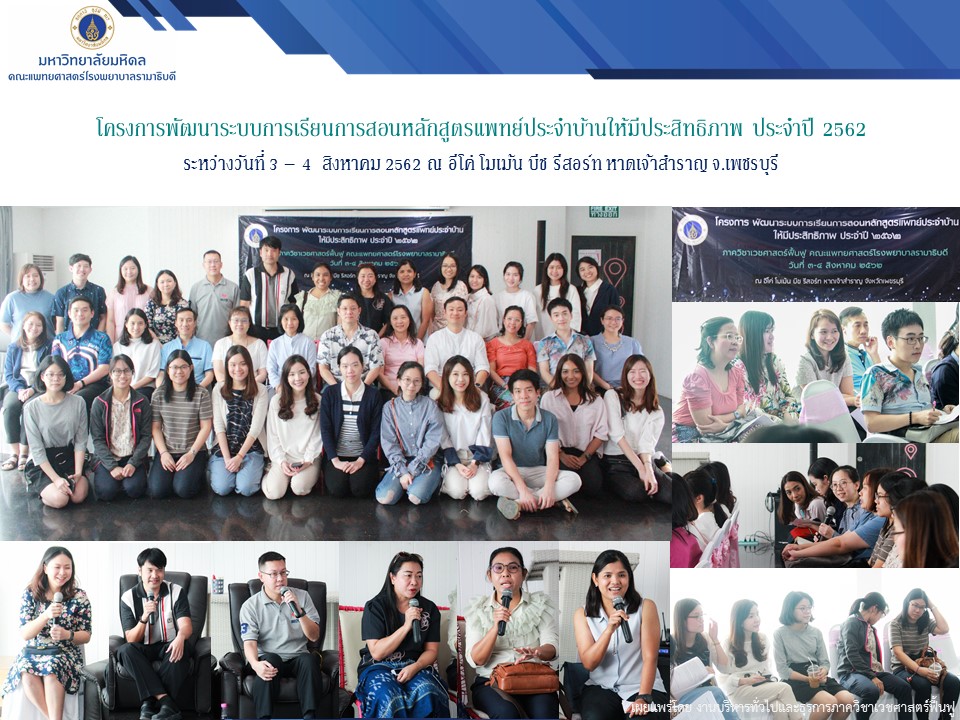 โครงการพัฒนาระบบการเรียนการสอนหลักสูตรแพทย์ประจำบ้านให้มีประสิทธิภาพ ประจำปี 2562 ระหว่างวันที่ 3-4 สิงหาคม 2562 ณ อีโค่ โมเม้น บีช รีสอร์ท หาดเจ้าสำราญ จ.เพชรบุรี