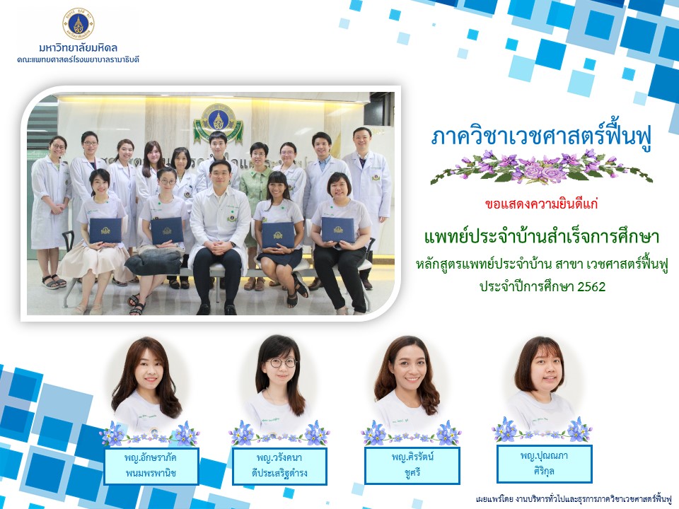 แพทย์ประจำบ้านสำเร็จการศึกษาหลักสูตรแพทย์ประจำบ้าน สาขา เวชศาสตร์ฟื้นฟู ประจำปีการศึกษา 2562 1.แพทย์หญิงอักษราภัค พนมพรพานิช 2.แพทย์หญิงวรังคนา ดีประเสริฐดำรง 3.แพทย์หญิงศิรรัตน์ ชูศรี 4.แพทย์หญิงปุณณภา ศิริกุล