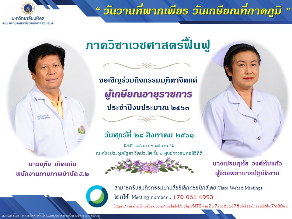 ภาควิชาเวชศาสตร์ฟื้นฟู ขอเชิญร่วมงานแสดงมุทิตาจิต เเด่ นายอุทัย เกิดแก่น และ นางเปรมฤทัย วงศ์ทับแก้ว