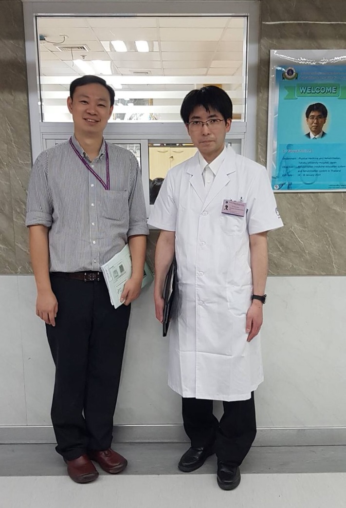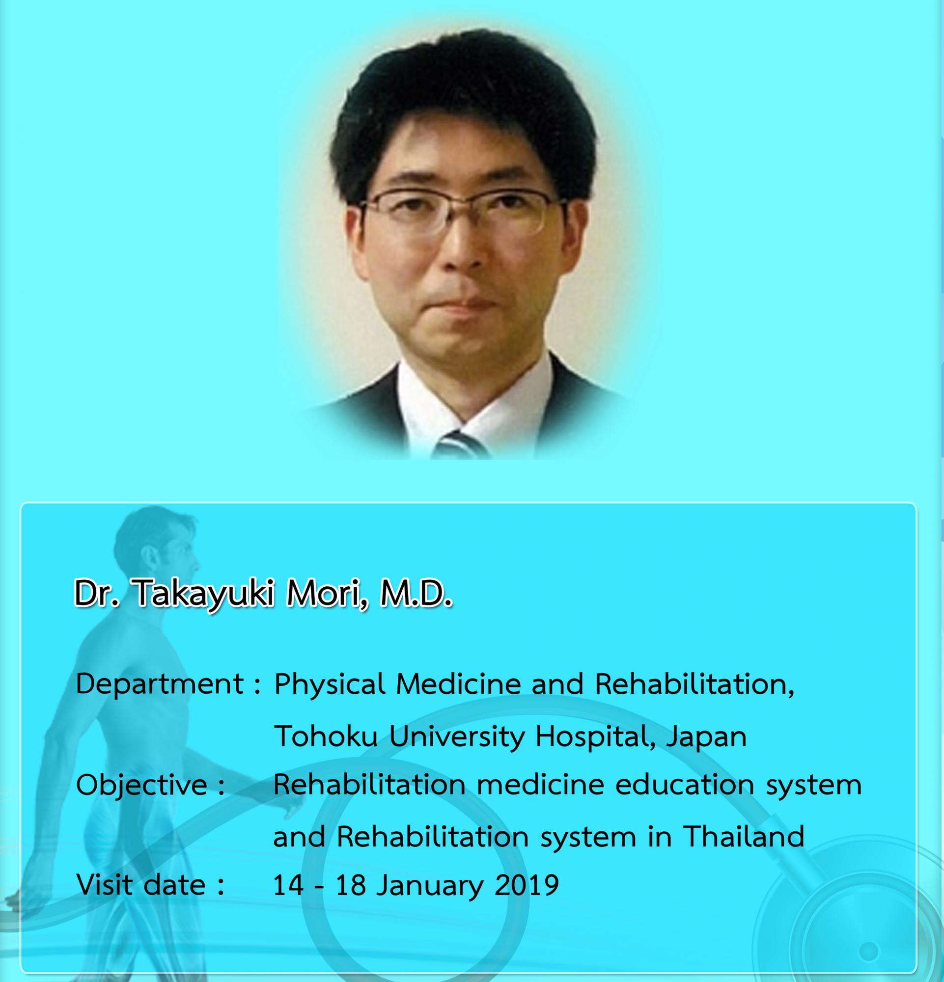 Dr.Takayuki Mori, MD. อาจารย์แพทย์ และ clinical fellowship ด้าน neurological rehabilitation จาก Rehabilitation Medicine department, Graduate school of Medicine Tohoku University hospital ศึกษาดูงานด้าน rehabilitation medical education system and rehabilitation system in Thailand ที่ภาควิชาเวชศาสตร์ฟื้นฟู ระหว่างวันที่ 14-18 มกราคม 2562
