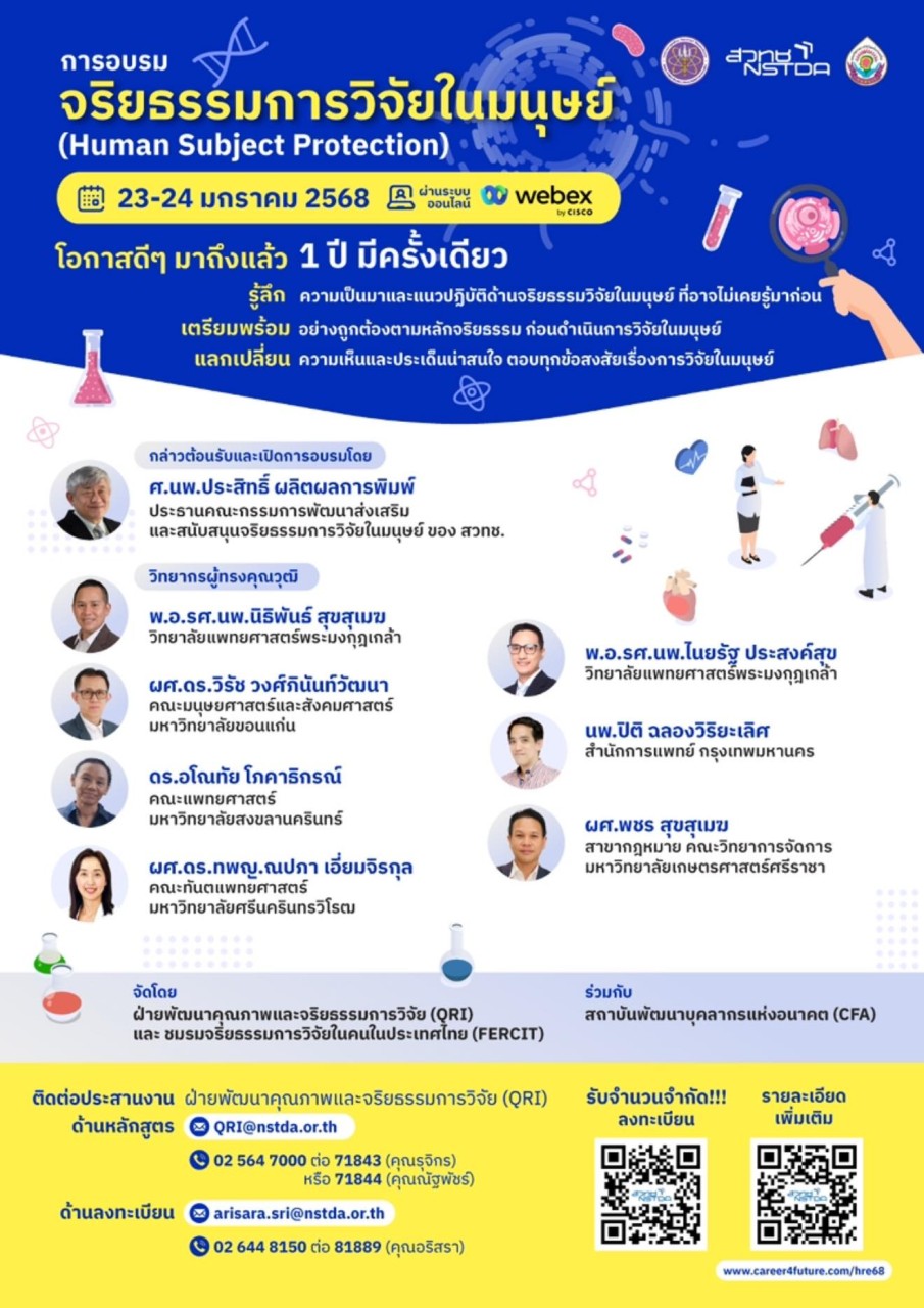 จัดโดย ฝ่ายพัฒนาคุณภาพและจริยธรรมการวิจัย ชมรมจริยธรรมการวิจัยในคนในประเทศไทย และสถาบันพัฒนาบุคลากรแห่งอนาคต สวทช.