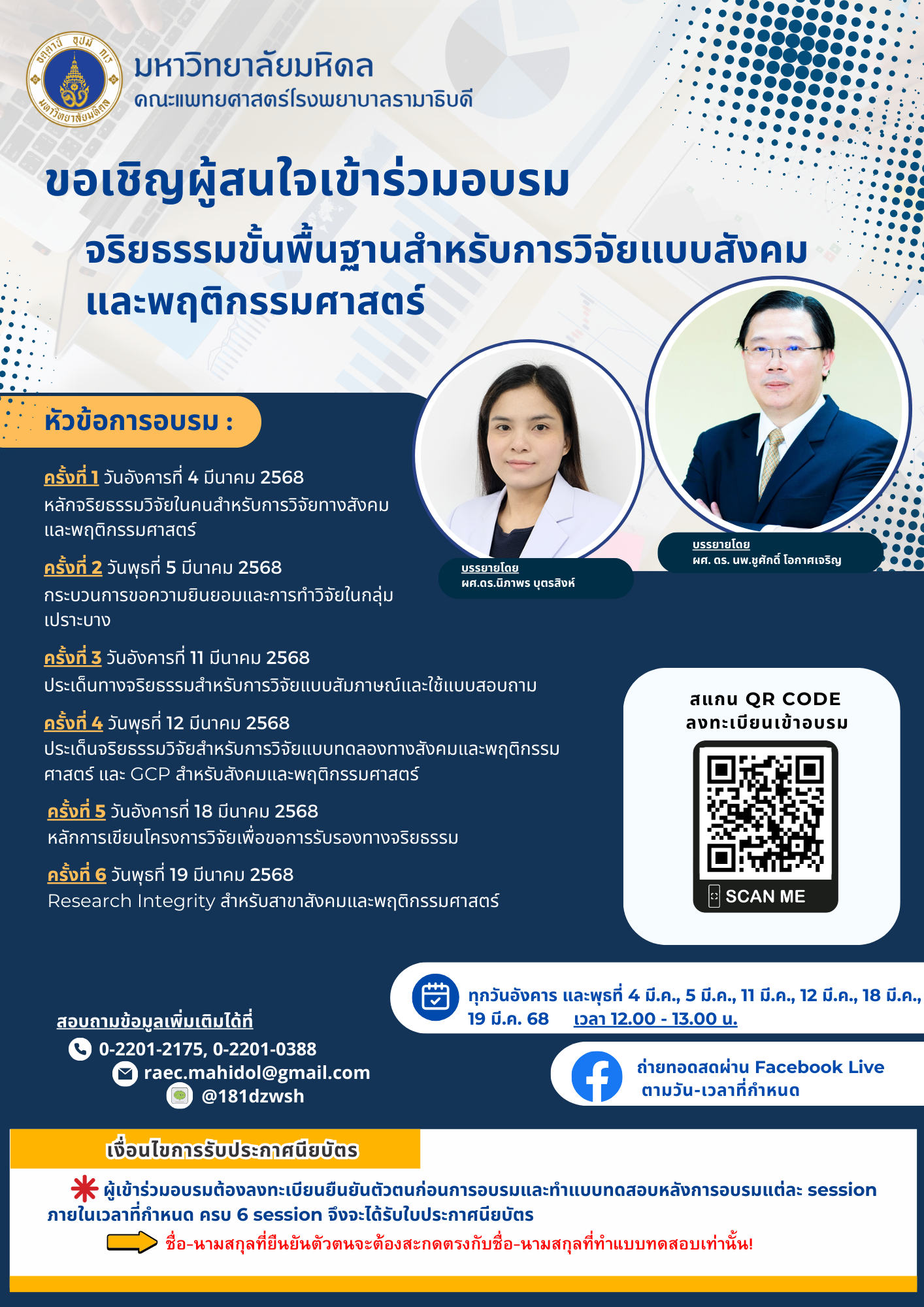 ผ่านทาง facebook live จริยธรรมการวิจัยในคน รามาธิบดี https://www.facebook.com/ethicsrama/