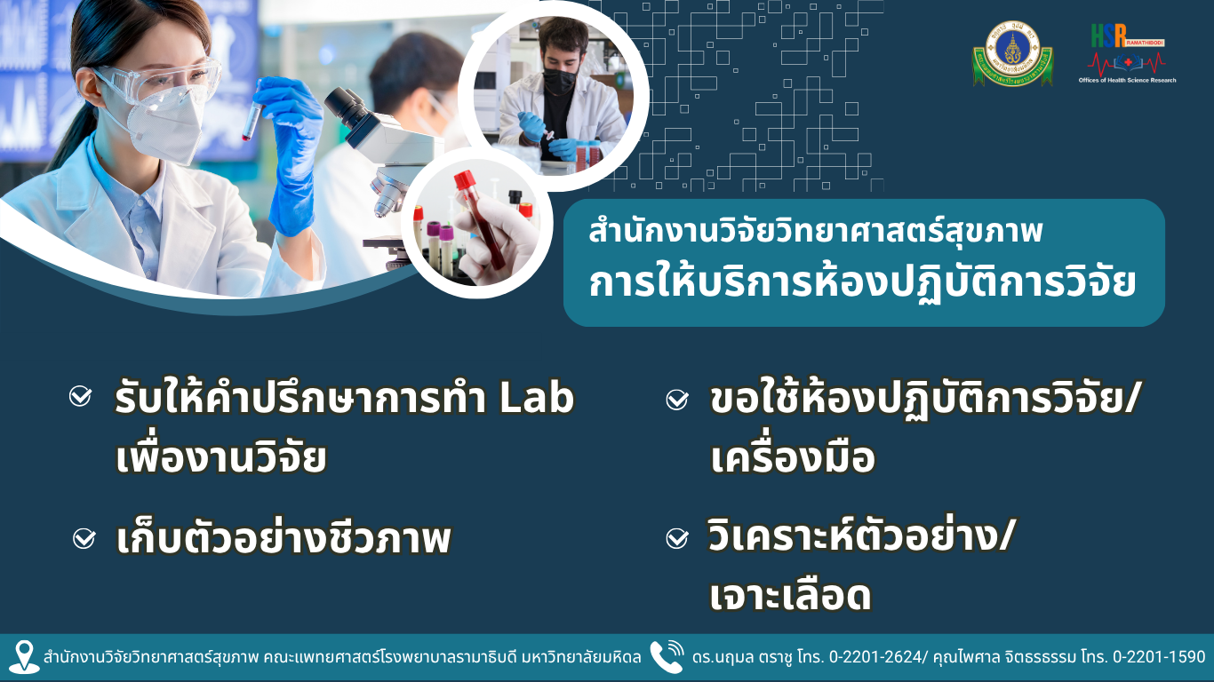 ห้องปฏิบัติการวิจัยกลางพญาไท ขอใช้ห้องปฏิบัติการ (online submission) บริการเครื่องมือ บริการวิเคราะห์ตัวอย่าง/เจาะเลือด บริการเก็บตัวอย่างชีวภาพ รับให้คำปรึกษาการทำ Lab เพื่อการวิจัย ห้องปฏิบัติการวิจัย ระบบความปลอดภัยทางชีวภาพ สัตว์ทดลอง การขอขึ้นทะเบียนคลังชีววัตถุ กลุ่มงานวิจัย ห้องปฏิบัติการวิจัย CNMI ห้องปฏิบัติการวิจัยอื่นภายในและภายนอกคณะฯ ศูนย์บริการพยาธิวิทยา ศูนย์จีโนมทางการแพทย์ ห้องปฏิบัติการกลางมหาวิทยาลัยมหิดล ศูนย์บริการวิเคราะห์ ทดสอบ สวทช.