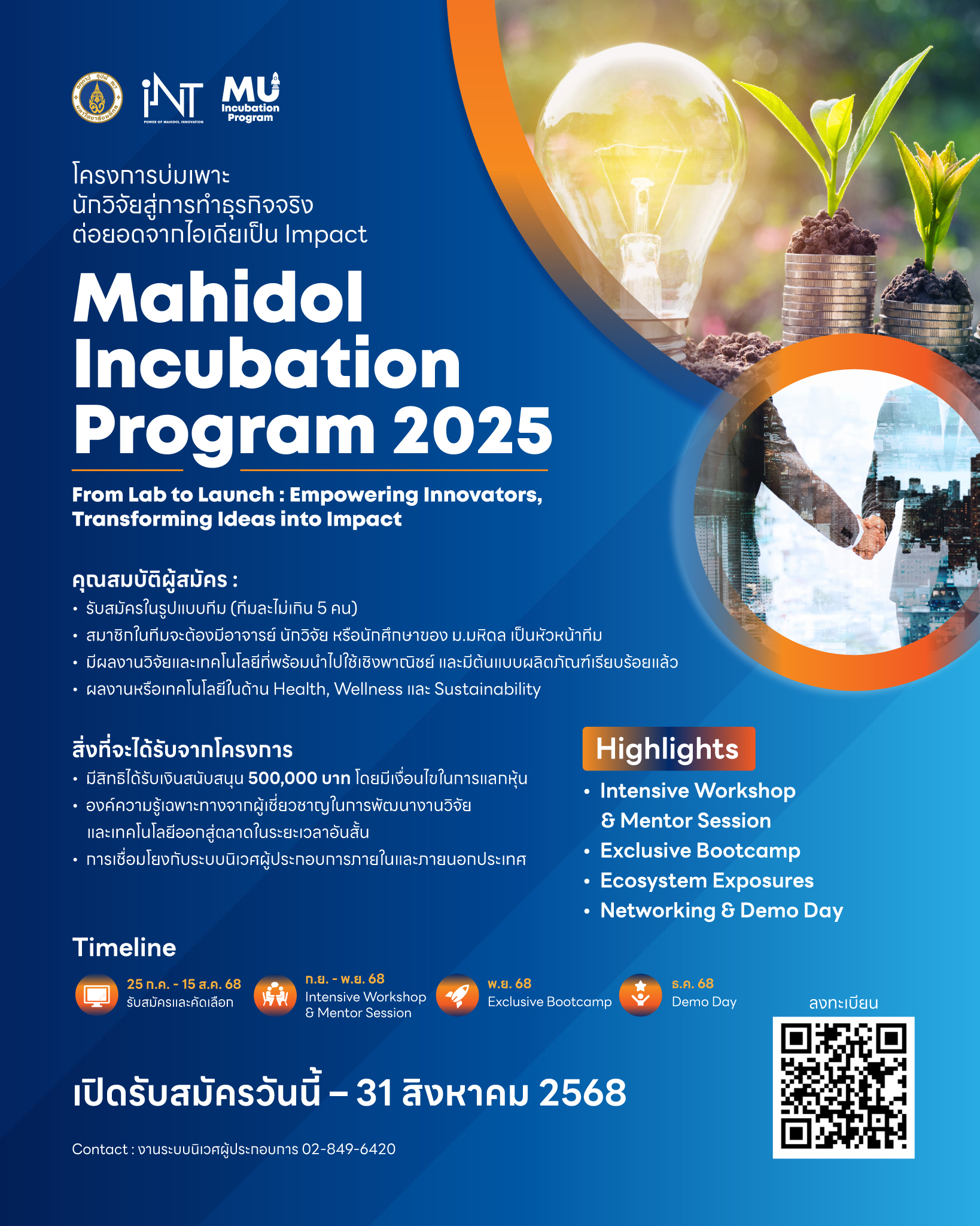 🔗 รายละเอียดเพิ่มเติม: https://int.mahidol.ac.th/2025/08/04/mahidol-incubation-program-2025/