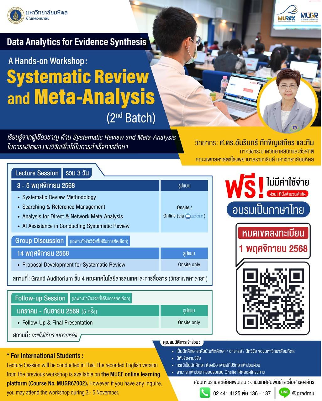 ️ขอเชิญเข้าร่วมอบรมเชิงปฏิบัติการ “Systematic Review and Meta-Analysis (2nd Batch)” ภายใต้หัวข้อ Data Analytics for Evidence Synthesis