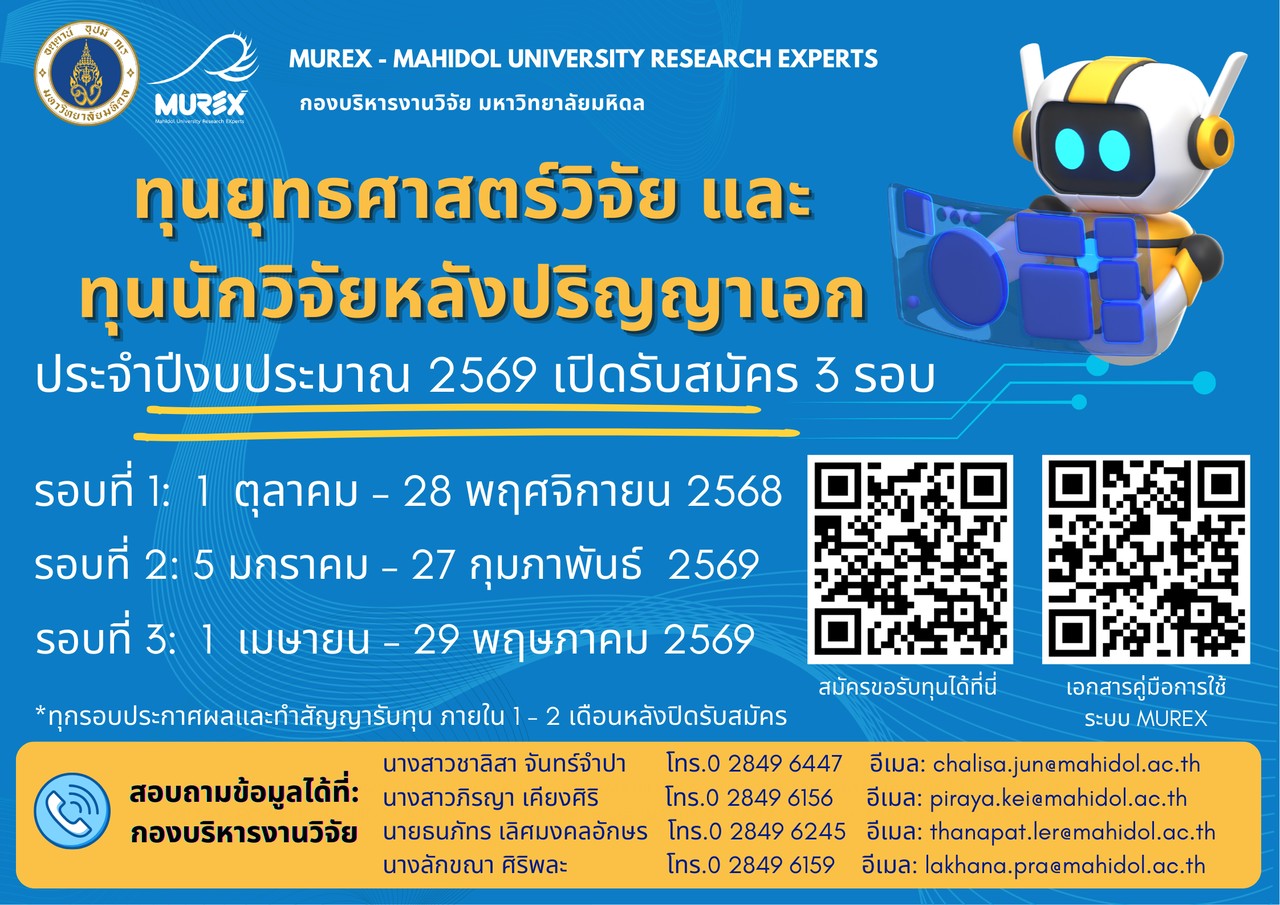 มหาวิทยาลัยมหิดล (MU) ขอเชิญผู้สนใจเข้ายื่นข้อเสนอโครงการ เพื่อขอรับทุนยุทธศาสตร์วิจัย และทุนนักวิจัยหลังปริญญาเอก ปีงบประมาณ 2569 รอบที่ 1