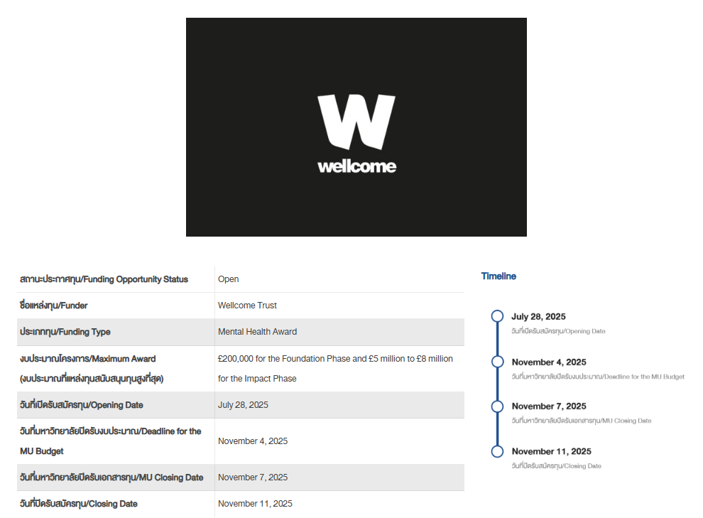 🚨 ผ่านระบบออนไลน์ของแหล่งทุนได้ที่ https://login-funding.wellcome.org/s/login ภายในวันที่ 11 พฤศจิกายน 2568