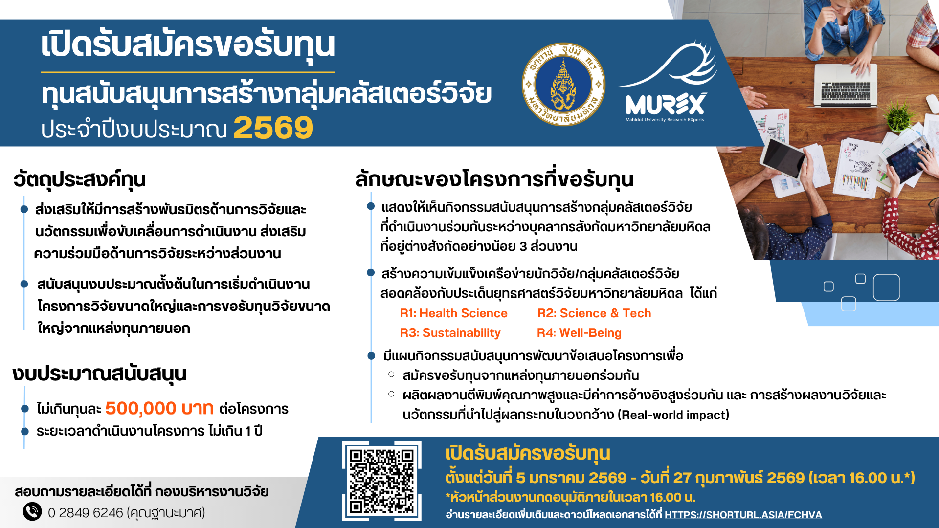 🚨 ยื่นข้อเสนอโครงการในระบบ MUREX Portal : https://mahidol.elsevierpure.com/ ภายในวันที่ 27 กุมภาพันธ์ 2569 เวลา 16.00 น.