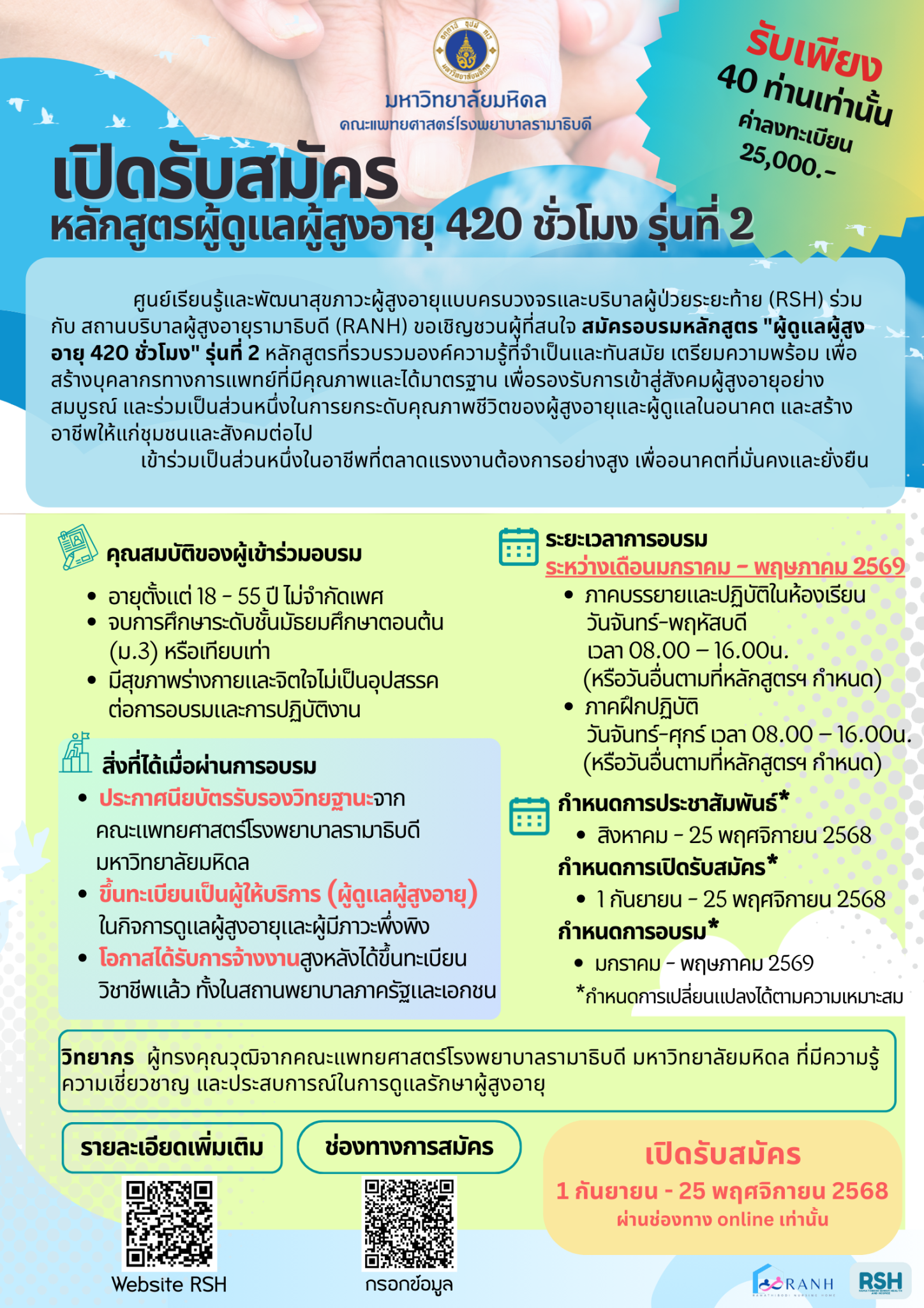 ศูนย์เรียนรู้และพัฒนาสุขภาวะผู้สูงอายุแบบครบวงจรและบริบาลผู้ป่วยระยะท้าย และสถานบริบาลผู้สูงอายุรามาธิบดี (Ramathibodi Nursing Home หรือ RANH) คณะแพทยศาสตร์โรงพยาบาลรามาธิบดี มหาวิทยาลัยมหิดล ได้ตระหนักถึงความสำคัญนี้ จึงได้ดำเนินการจัดทำโครงการอบรมหลักสูตร "ผู้ดูแลผู้สูงอายุ 420 ชั่วโมง" รุ่นที่ 2 เพื่อพัฒนาผู้ที่สนใจให้มีความรู้และทักษะที่ได้มาตรฐานตามข้อกำหนดของกระทรวงสาธารณสุข รวมถึงส่งเสริมให้มีแนวทางปฏิบัติที่ถูกต้องและปลอดภัยในการดูแลผู้สูงอายุ ทั้งในสถานพยาบาลและที่บ้าน นอกจากนี้ หลักสูตรยังช่วยเพิ่มโอกาสในการประกอบอาชีพและยกระดับคุณภาพชีวิตของทั้งผู้สูงอายุและผู้ดูแลเอง