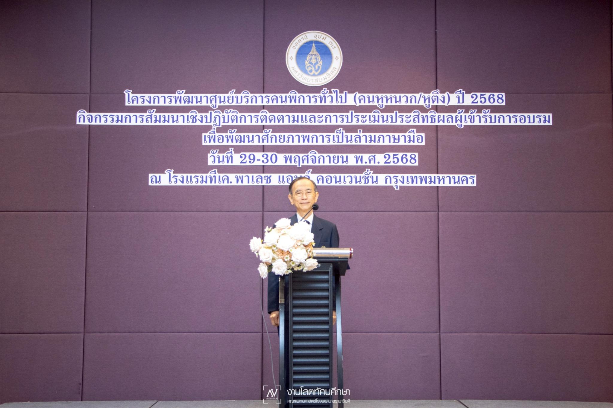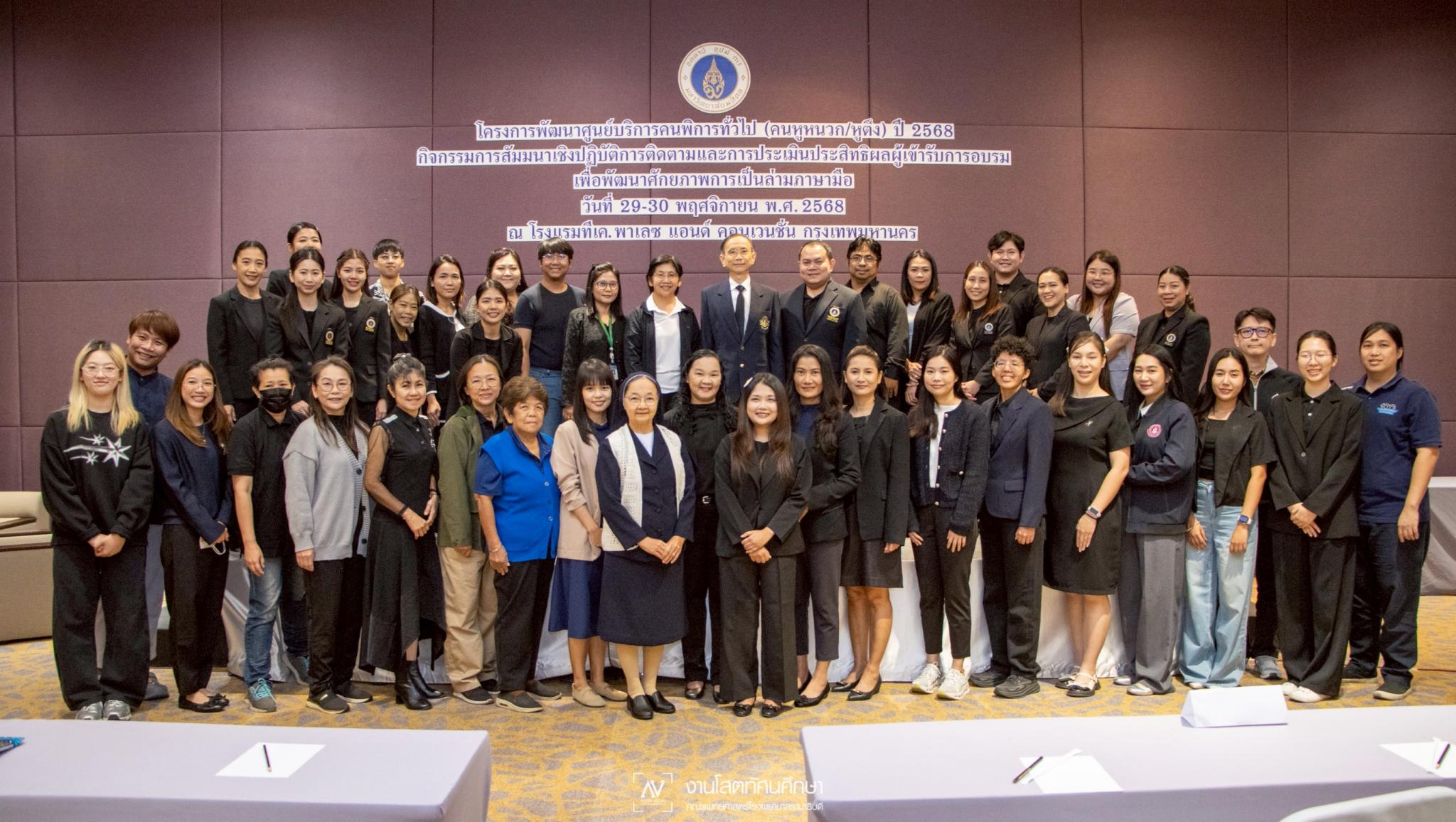 เมื่อวันที่ 29 – 30 พฤศจิกายน 2568 นำโดย อาจารย์นายแพทย์สมเกียรติ ลีละศิธร ผู้อำนวยการสถาบันราชสุดา พร้อมด้วยทีมผู้บริหาร ทีมล่ามภาษามือ และทีมสนับสนุน สถาบันราชสุดา คณะแพทยศาสตร์โรงพยาบาลรามาธิบดี มหาวิทยาลัยมหิดล ดำเนินการจัดกิจกรรมสัมมนาเชิงปฏิบัติการติดตามและประเมินประสิทธิผลผู้เข้ารับการอบรมเพื่อพัฒนาศักยภาพการเป็นล่ามภาษามือ ภายใต้โครงการพัฒนาศูนย์บริการคนพิการทั่วไป (คนหูหนวก/คนหูตึง) ปี 2568 ติดตามและประเมินประสิทธิผลของหลักสูตรอบรมล่ามภาษามือ 135 ชั่วโมง ณ โรงแรม ทีเค. พาเลซ แอนด์คอนเวนชั่น กรุงเทพมหานคร โดยมีวัตถุประสงค์เพื่อนำความรู้และทักษะไปประยุกต์ใช้ในการปฏิบัติงาน นำเสนอแนวทางในการพัฒนาศักยภาพล่ามภาษามือยกระดับมาตรฐานการบริการล่ามภาษามือ ซึ่งมีผู้เข้าร่วมกิจกรรมจำนวน 28 คน