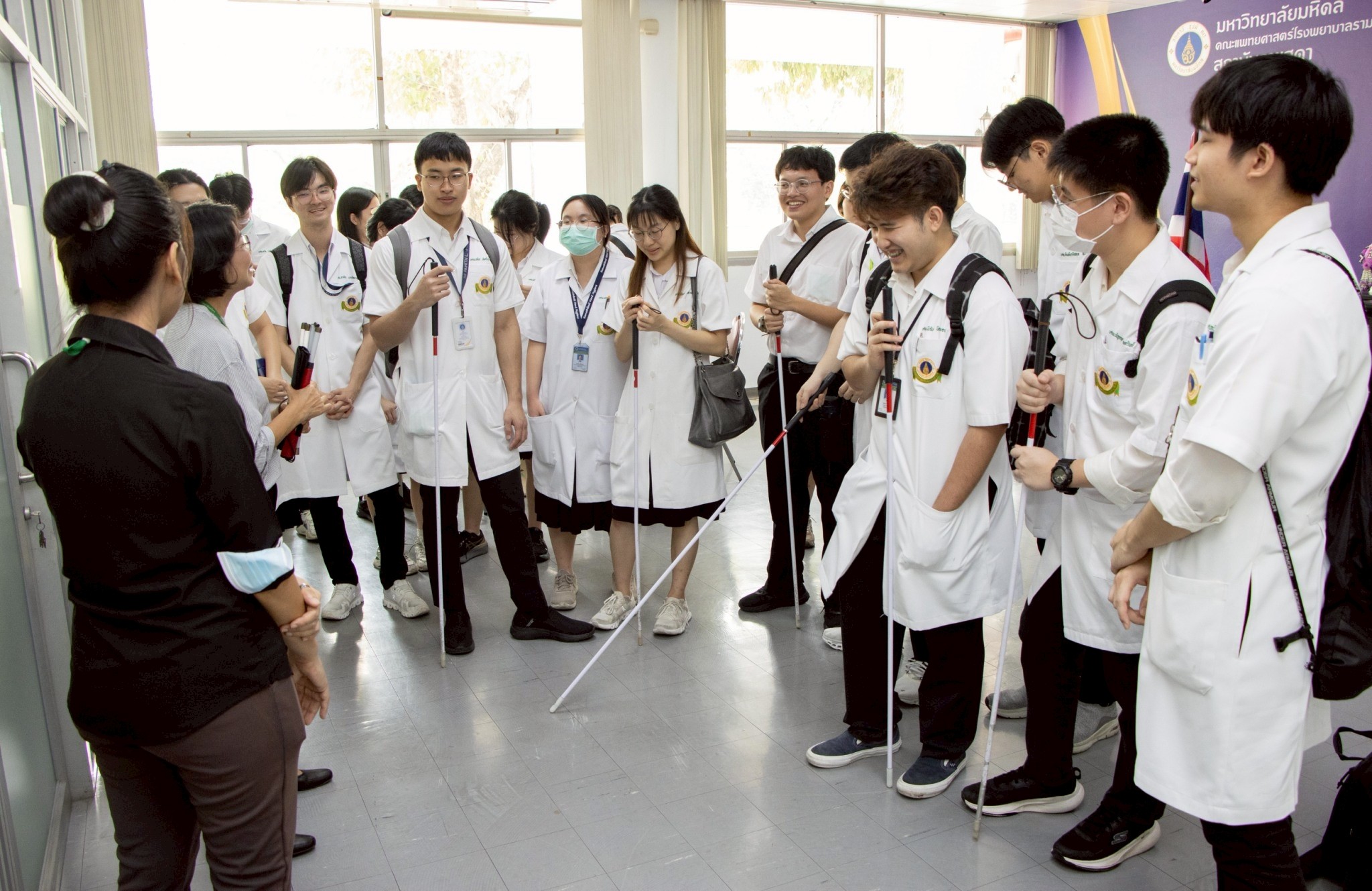 เมื่อวันจันทร์ที่ 10 พฤศจิกายน 2568 อาจารย์ นายแพทย์สมเกียรติ ลีละศิธร ผู้อำนวยการสถาบันราชสุดา คณะแพทยศาสตร์โรงพยาบาลรามาธิบดี มหาวิทยาลัยมหิดล ให้การต้อนรับนักศึกษาแพทย์ชั้นปีที่ 4 จากภาควิชาจักษุวิทยา คณะแพทยศาสตร์โรงพยาบาลรามาธิบดี มหาวิทยาลัยมหิดล จำนวน 21 คน เข้าศึกษาดูงานงานบริการและพัฒนาคุณภาพชีวิตผู้พิการ (งานบริการวิชาการด้านคนพิการทางการเห็น และหน่วยเทคโนโลยีสิ่งอำนวยความสะดวกสำหรับคนพิการ) โดยมีบุคลากรจากหน่วยงานที่เกี่ยวข้องให้ความรู้ในด้านต่าง ๆ ณ สถาบันราชสุดา คณะแพทยศาสตร์โรงพยาบาลรามาธิบดี มหาวิทยาลัยมหิดล