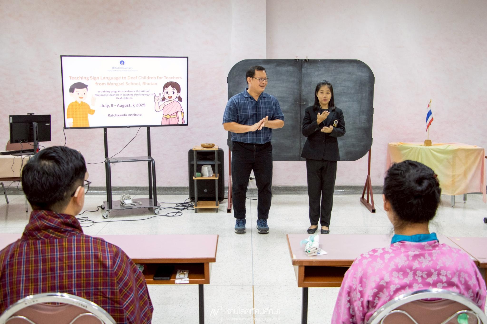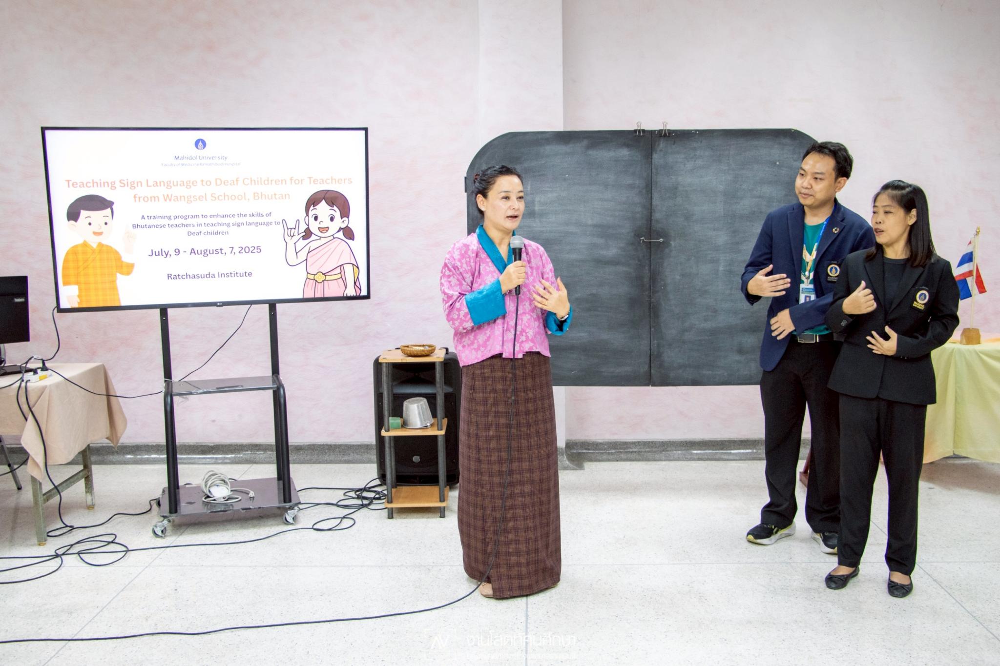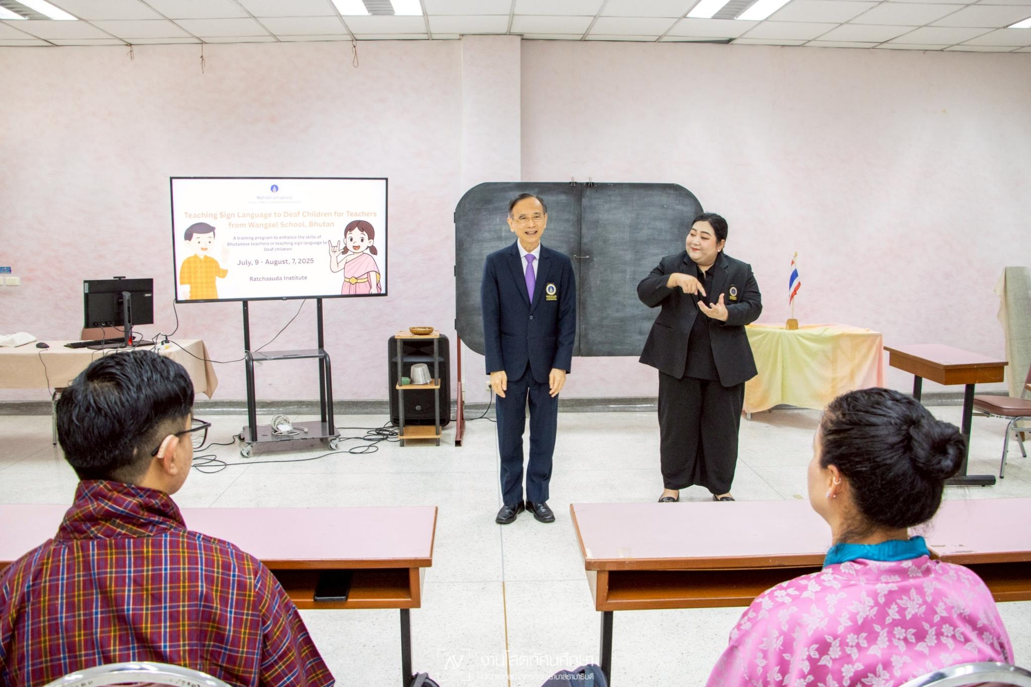 อาจารย์นายแพทย์สมเกียรติ ลีละศิธร ผู้อำนวยการสถาบันราชสุดา ให้เกียรติเป็นประธานในพิธีเปิดโครงการฝึกอบรม “Training Program: Teaching Sign Language to Deaf Children for the Deaf Instructors from Wangsel Institute for the Deaf, Kingdom of Bhutan” ซึ่งเป็นการฝึกอบรบที่จัดขึ้นเพื่อเสริมสร้างองค์ความรู้และทักษะในการสอนภาษามือแก่คณาจารย์ชาวภูฏานจาก Wangsel Institute for the Deaf จำนวน 8 ท่าน นำโดย Ms. Sushila Gurung โดยมุ่งหวังให้ผู้เข้ารับการอบรมมีความสามารถในการออกแบบหลักสูตรการเรียนการสอนภาษามือที่เหมาะสมกับนักเรียนที่มีความบกพร่องทางการได้ยินในแต่ละช่วงวัย ได้แก่ ระดับอนุบาล ประถมศึกษา และมัธยมศึกษา