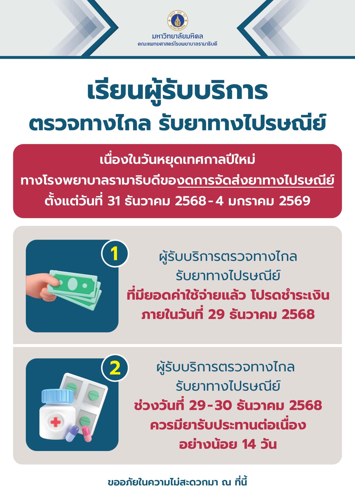 เนื่องในวันหยุดเทศกาลปีใหม่ ทางโรงพยาบาลรามาธิบดีของดการจัดส่งยาทางไปรษณีย์ ตั้งแต่วันที่ 31 ธันวาคม 2568 - 4 มกราคม 2569