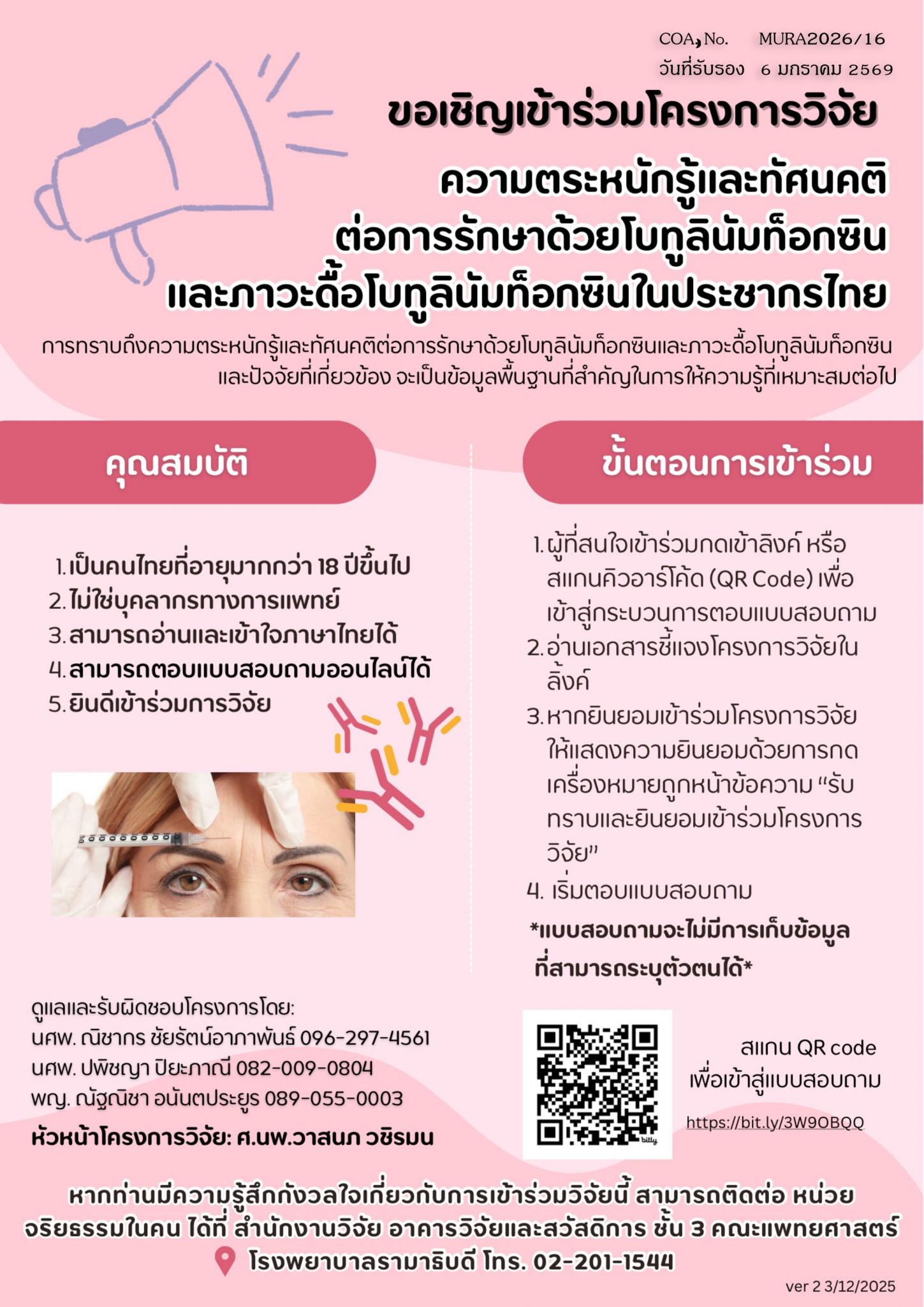 ขอเชิญเข้าร่วมโครงการวิจัยความตระหนักรู้และทัศนคติต่อการรักษาโรคด้วยโบทูลินัมท็อกซิน และภาวะดื้อโบทูลินัมท็อกซินในประชากรไทย