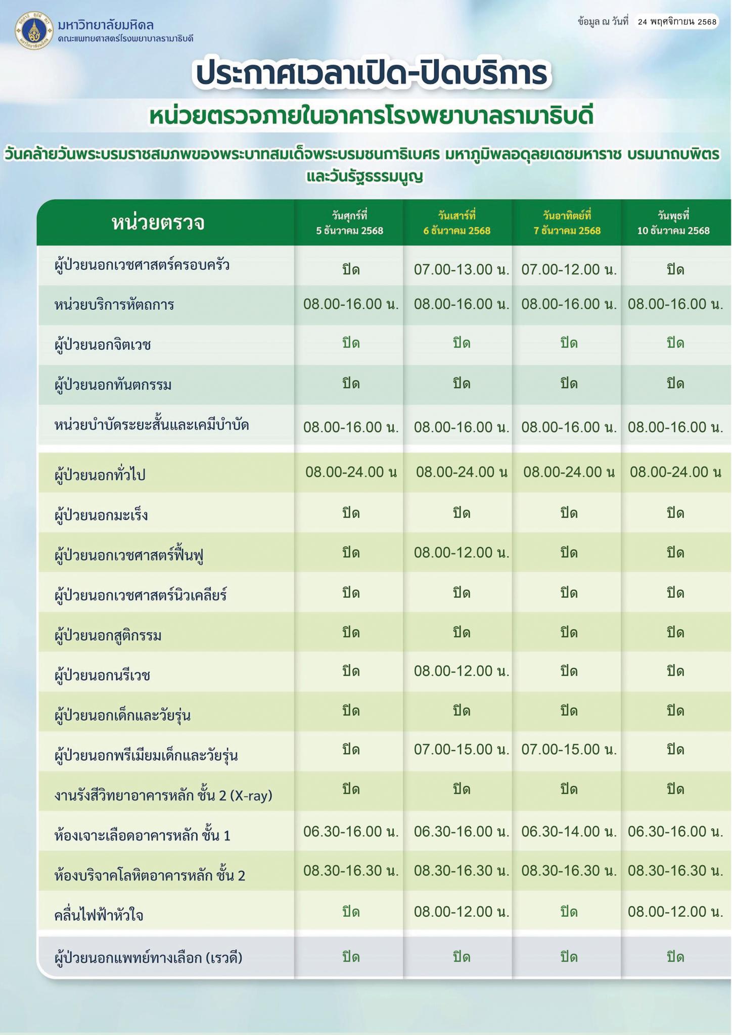 ประกาศเปิด-ปิดบริการชั่วคราว คลินิกในเวลา คลินิกนอกเวลา โรงพยาบาลรามาธิบดี เนื่องในวันพระบรมราชสมภพของพระบาทสมเด็จพระบรมชนกาธิเบศร มหาภูมิพลอดุลยเดชมหาราช บรมนาถบพิตร และวันรัฐธรรมนูญ