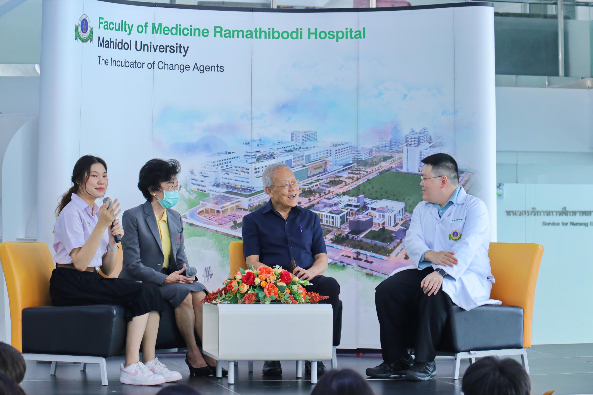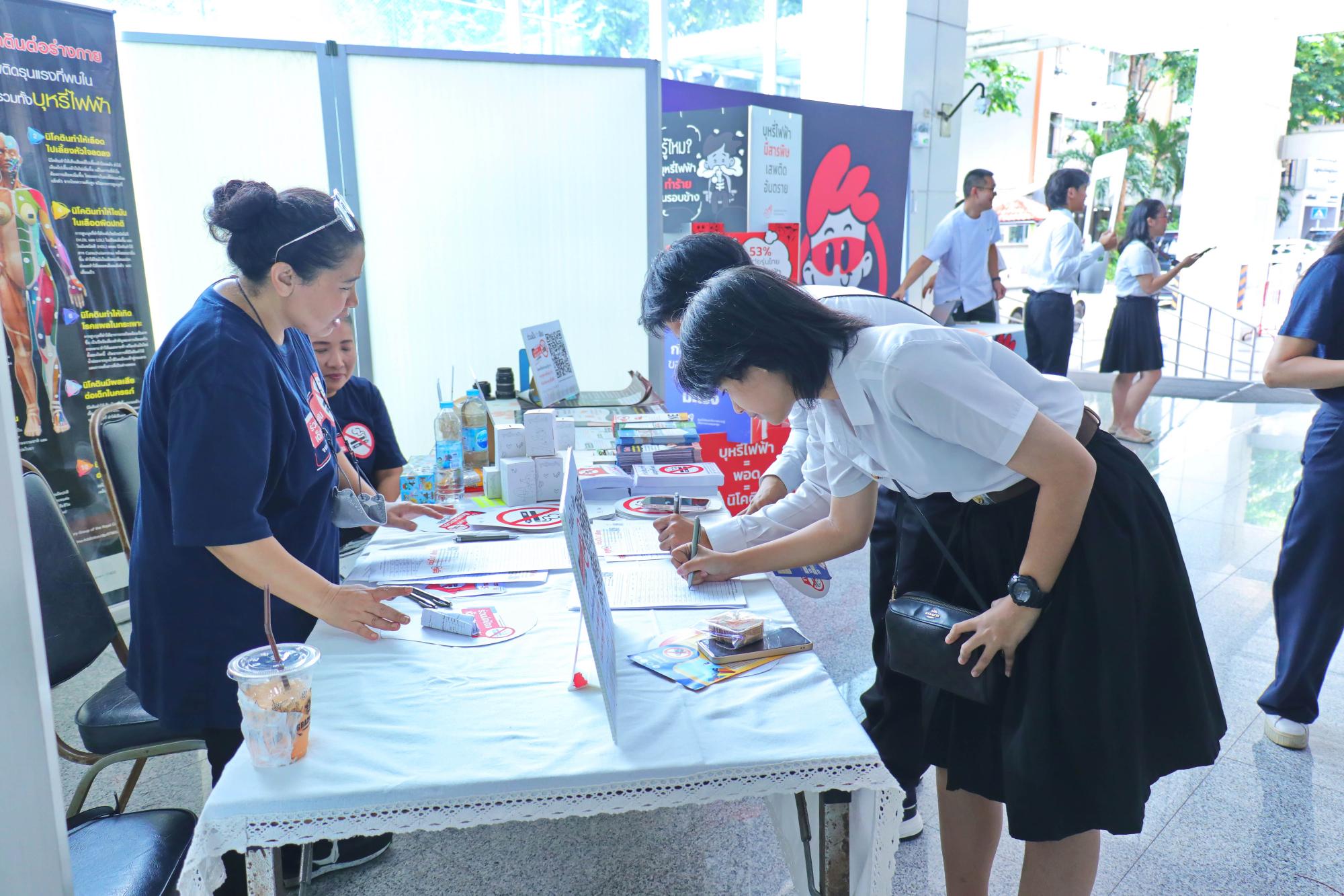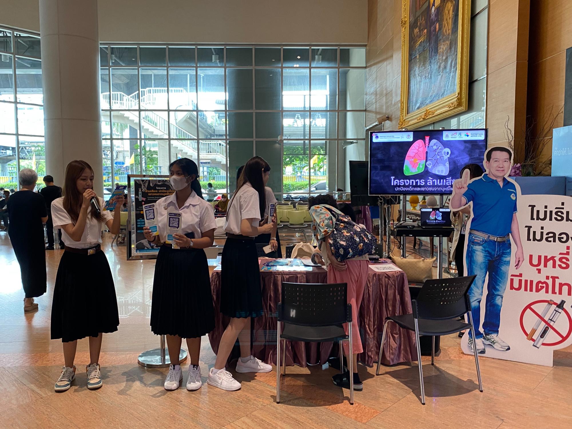 สภานักศึกษาแพทย์รามาธิบดี ร่วมกับงานกิจการนักศึกษา สำนักงานการศึกษา โครงการล้านเสียง...เพื่อปกป้องเด็กและเยาวชนจากบุหรี่ไฟฟ้า โดยได้รับเกียรติจาก ศ.เกียรติคุณ นพ.ประกิต วาทีสาธกกิจ ประธานมูลนิธิรณรงค์เพื่อการไม่สูบบุหรี่ ศ.พญ.สุวรรณา เรืองกาญจนเศรษฐ์ และ รศ.นพ.สหภูมิ ศรีสุมะ ร่วมแลกเปลี่ยนในกิจกรรม session talk ภายใต้หัวข้อ โทษของบุหรี่ไฟฟ้า และการบังคับใช้กฎหมายในไทย เมื่อวันที่ 24 กรกฎาคม พ.ศ. 2567 ณ โถงชั้น 1 อาคารเรียนและปฏิบัติการรวมด้านการแพทย์และโรงเรียนพยาบาลรามาธิบดี คณะแพทยศาสตร์โรงพยาบาลรามาธิบดี มหาวิทยาลัยมหิดล และ โถงชั้น 1 ศูนย์การแพทย์สมเด็จพระเทพรัตน์