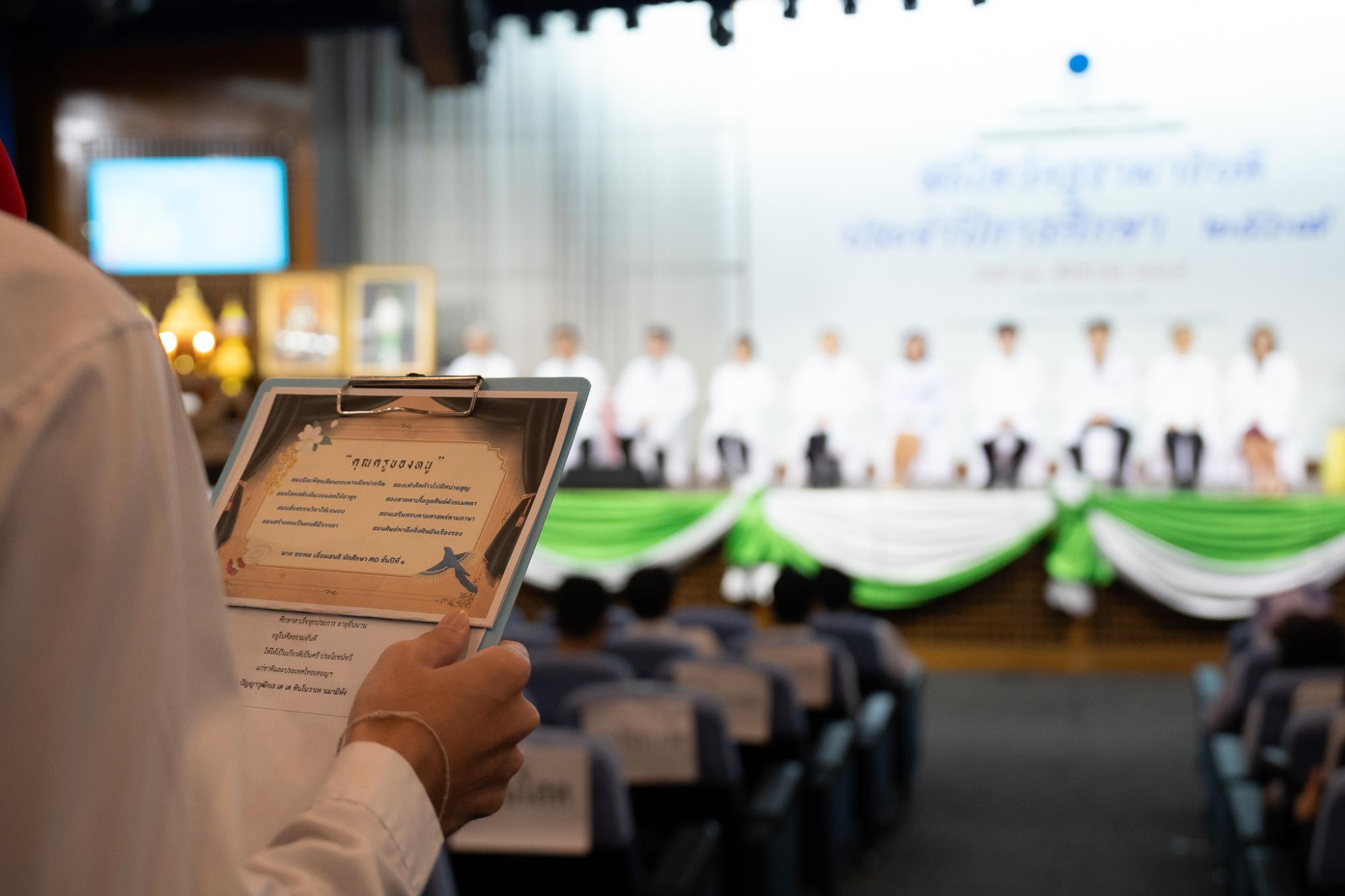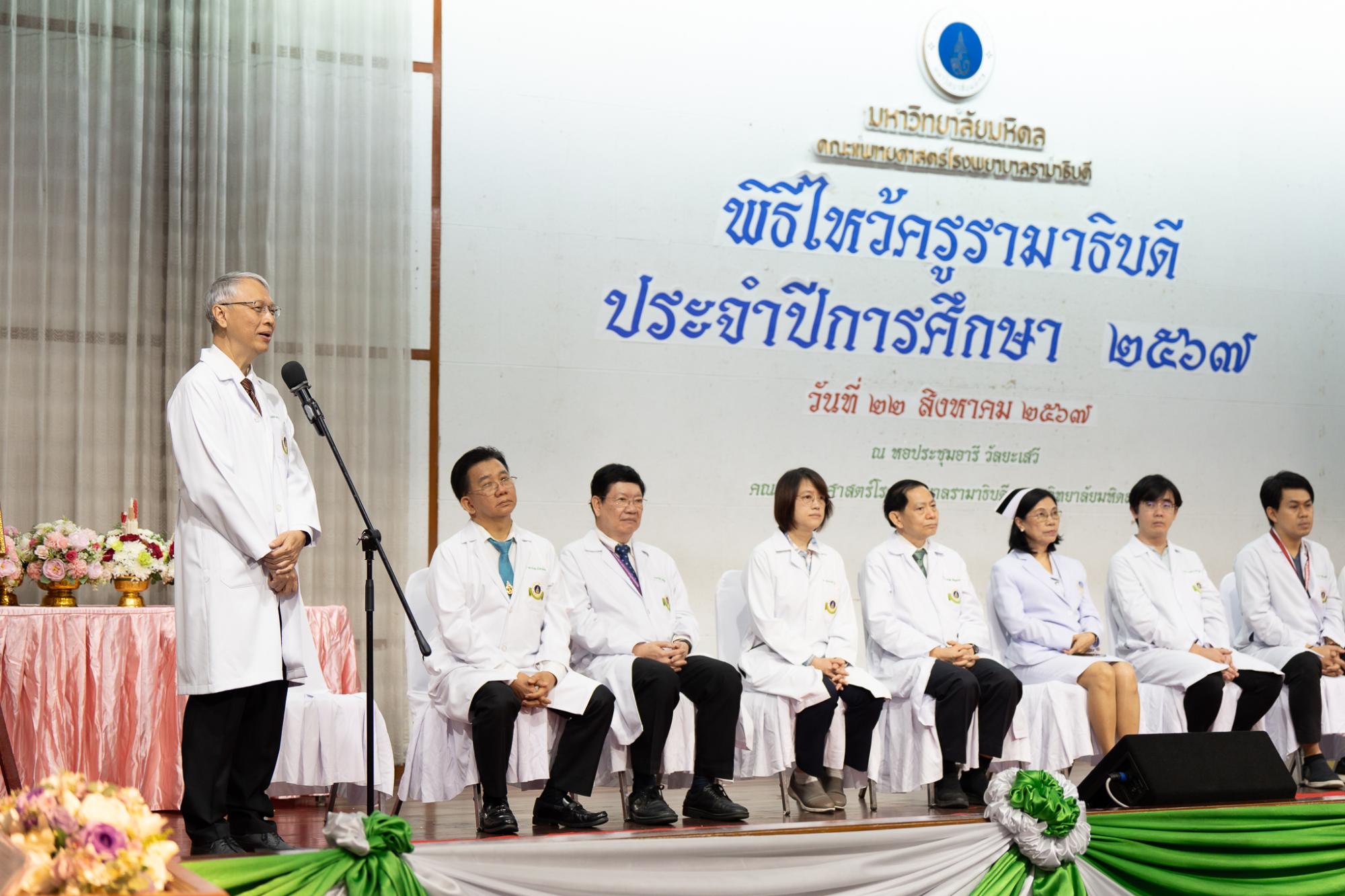 งานกิจการนักศึกษา สำนักงานการศึกษา คณะแพทยศาสตร์โรงพยาบาลรามาธิบดี มหาวิทยาลัยมหิดล ร่วมกับสโมสรนักศึกษารามาธิบดี จัดพิธีไหว้ครูรามาธิบดี ประจำปีการศึกษา2567 โดยได้รับเกียรติจาก ศ.คลินิก นพ.อาทิตย์ อังกานนท์ คณบดีคณะแพทยศาสตร์โรงพยาบาลรามาธิบดี มหาวิทยาลัยมหิดล เป็นประธานในพิธีกล่าวให้โอวาทเนื่องในงานพิธีไหว้ครูรามาธิบดี พร้อมด้วยผู้แทนคณาจารย์รับพาน และอาจารย์ประจำคณะแพทยศาสตร์โรงพยาบาลรามาธิบดี เข้าร่วมพิธีในครั้งนี้ เมื่อวันที่ 22 สิงหาคม 2567 ระหว่างเวลา 08.00 - 09.30 น. ณ หอประชุมอารี วัลยะเสวี คณะแพทยศาสตร์โรงพยาบาลรามาธิบดี